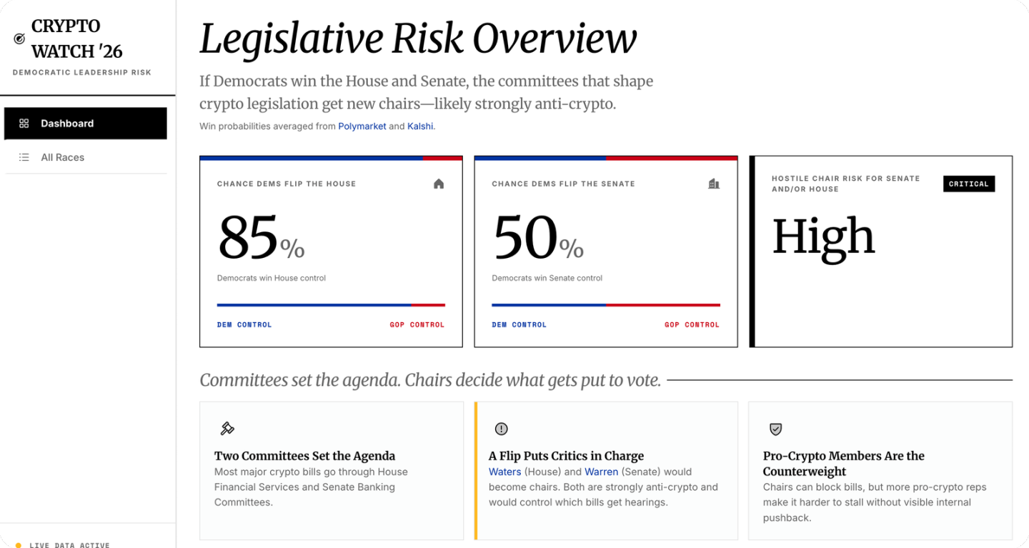 民主党夺回众议院的概率高达 85%,这意味着 Waters 将大概率执掌众议院金融服务委员会,拥有重组小组委员会、掌控立法议程的绝对权力。仅存的亮点极为有限:Menefee 有望击败 Green 夺得席位,Gonzalez 大概率能保住现有席位。这些情况或许能形成一定制衡,但无法改变权力核心 —— 主席职位的归属。
