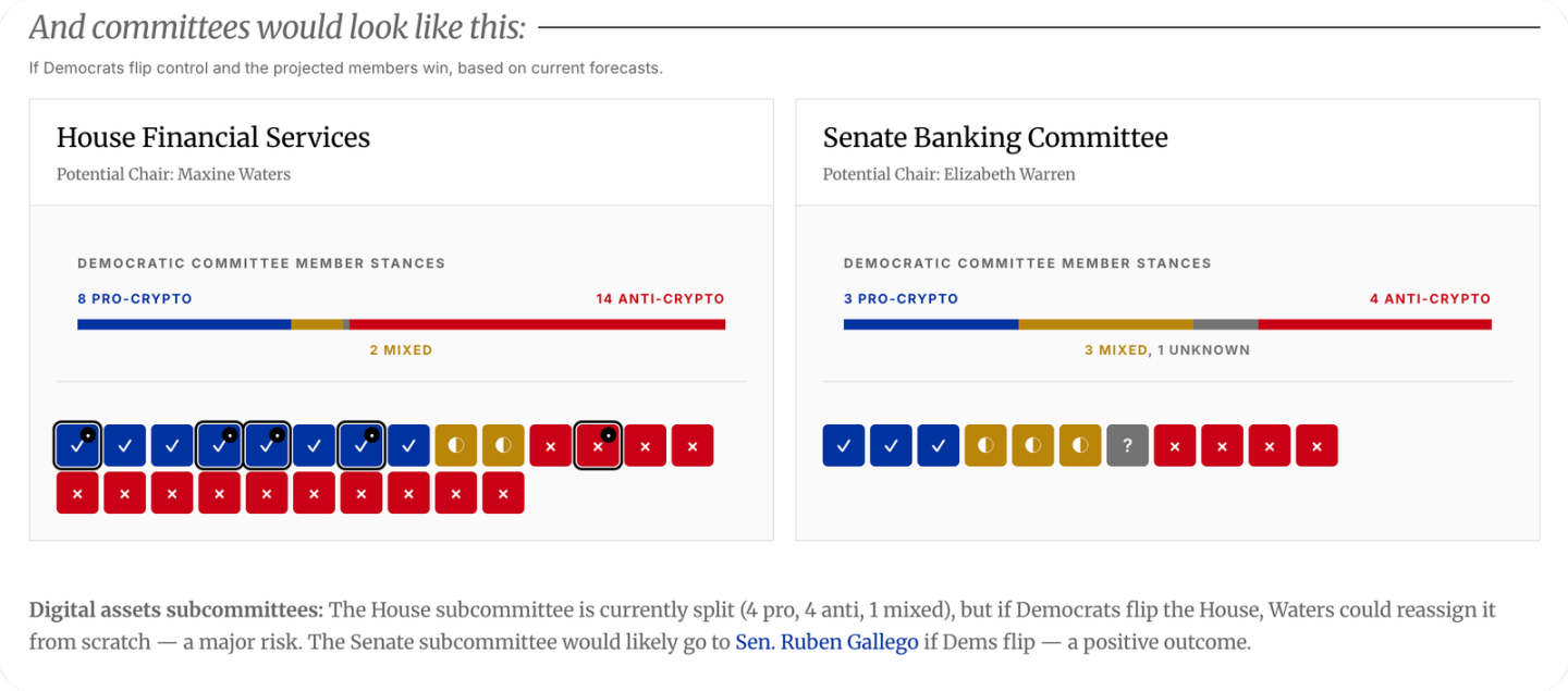 这张图展示了如果民主党在 2026 年中期选举中夺回国会控制权后,两大核心委员会的加密立场分布,直观反映了加密行业将面临的监管格局。