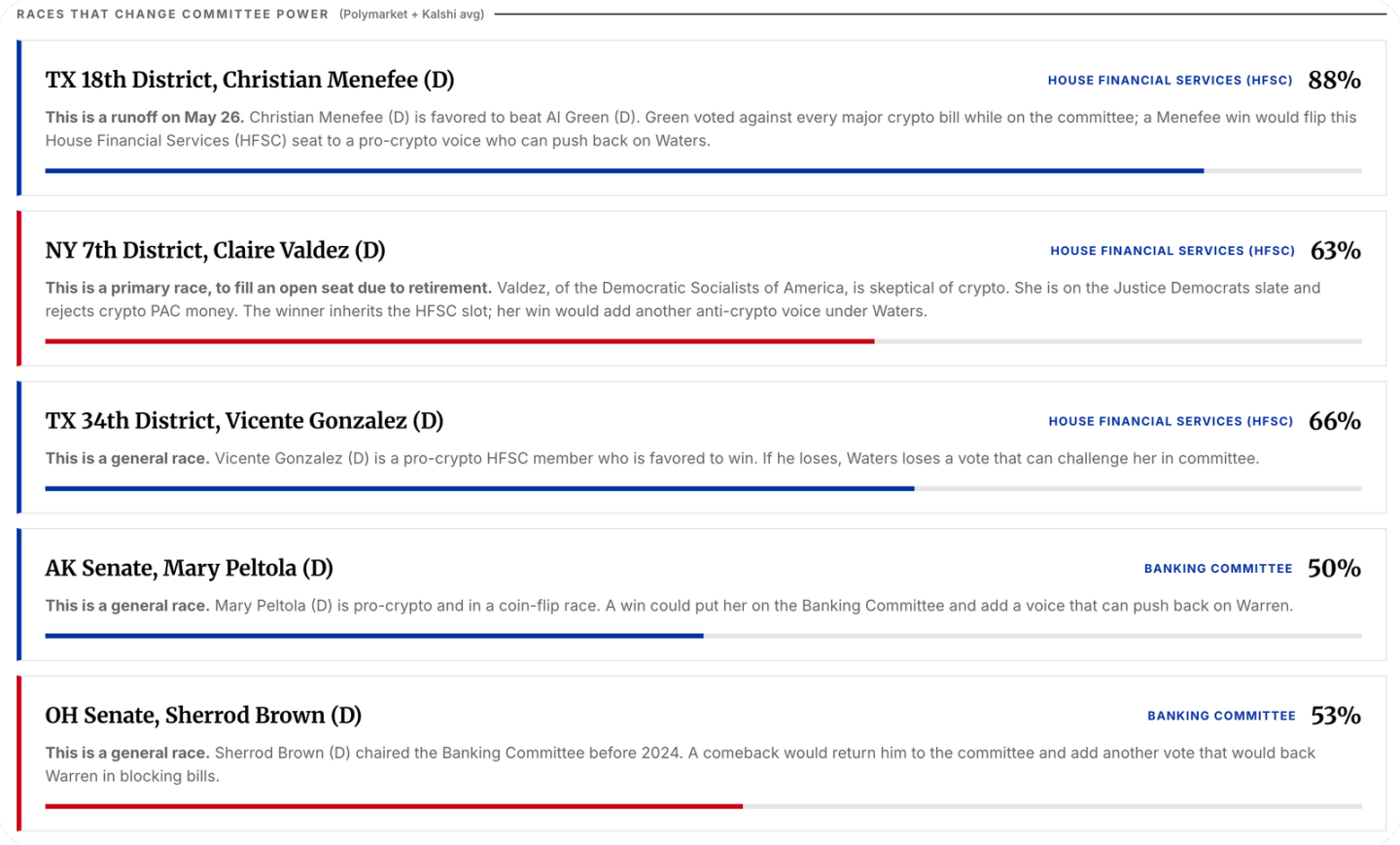 现存的支持加密的民主党议员,大多未进入众议院金融服务委员会或参议院银行委员会。他们固然可以在全院表决中对相关法案投出支持票,也可以向党内领导层施压(但鉴于该议题已高度党派化,多数议员不愿为加密行业发声),但他们无法强迫委员会主席推进立法进程。