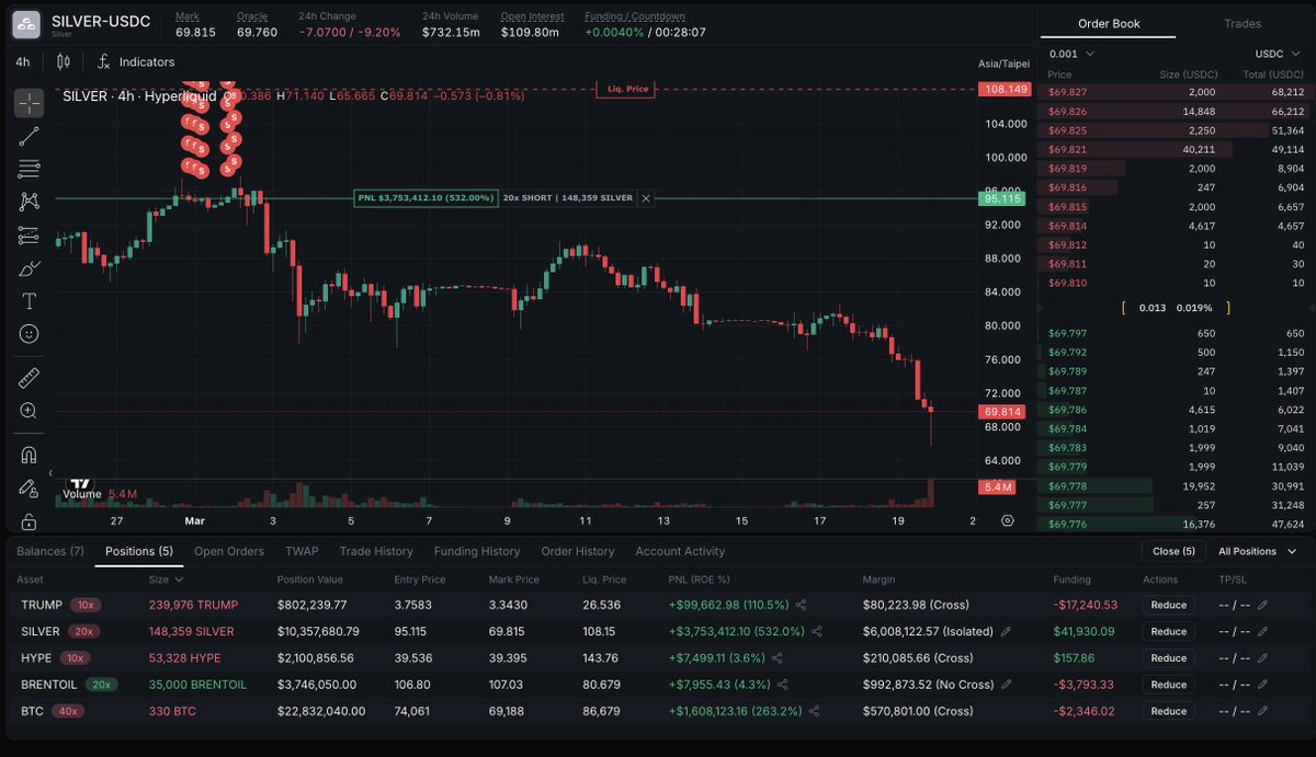 “UnRektCapital”在做空白银的过程中,目前盈利370万美元。他在他的永续合约账户上的总盈利为620万美元。