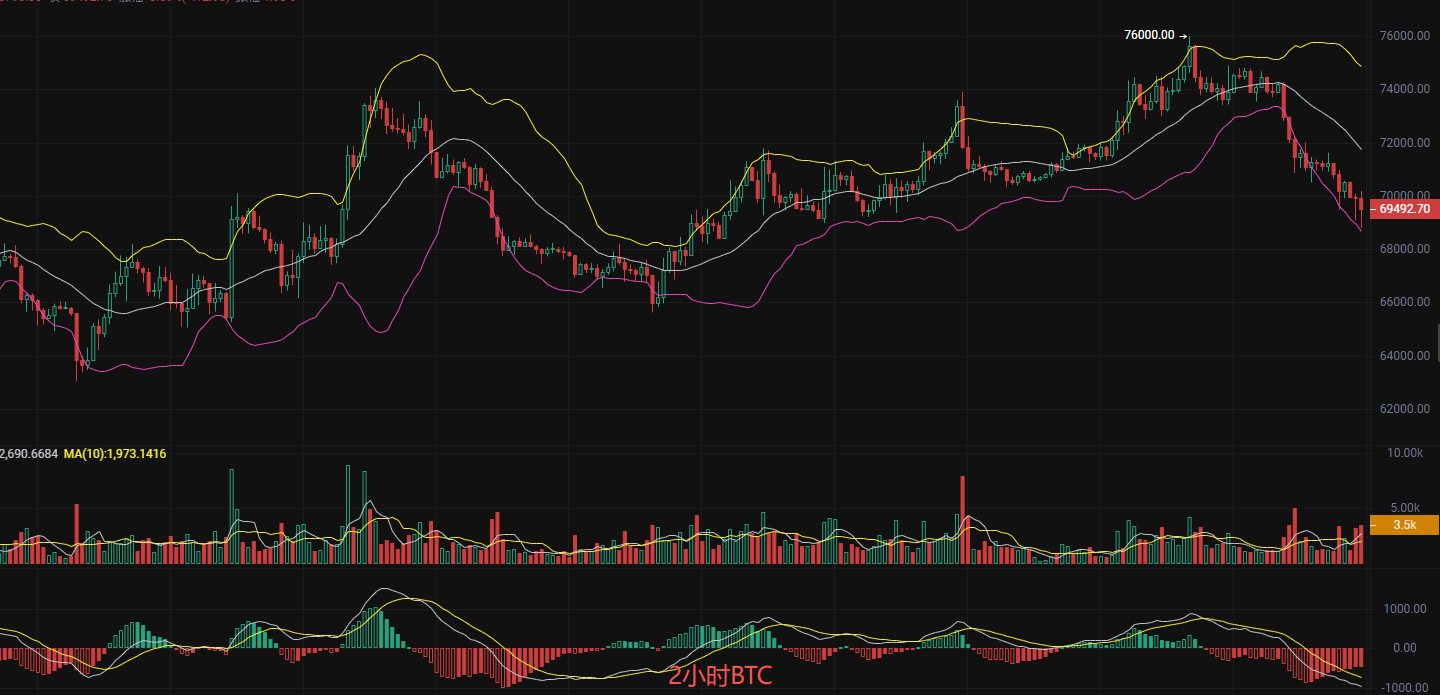目前盘口的K线已经跌破下轨68626后快速反弹,目前在中轨71760下方震荡。布林带开口收窄,说明短期波动将收敛,反弹一触即发!MACD绿柱放大,空头动能仍在释放,但未创新低前低62510,当前68793远高于此,有底背离风险!下跌过程放量恐慌盘集中涌出,反弹时缩量买盘悄然进场,典型的洗盘后蓄力形态!