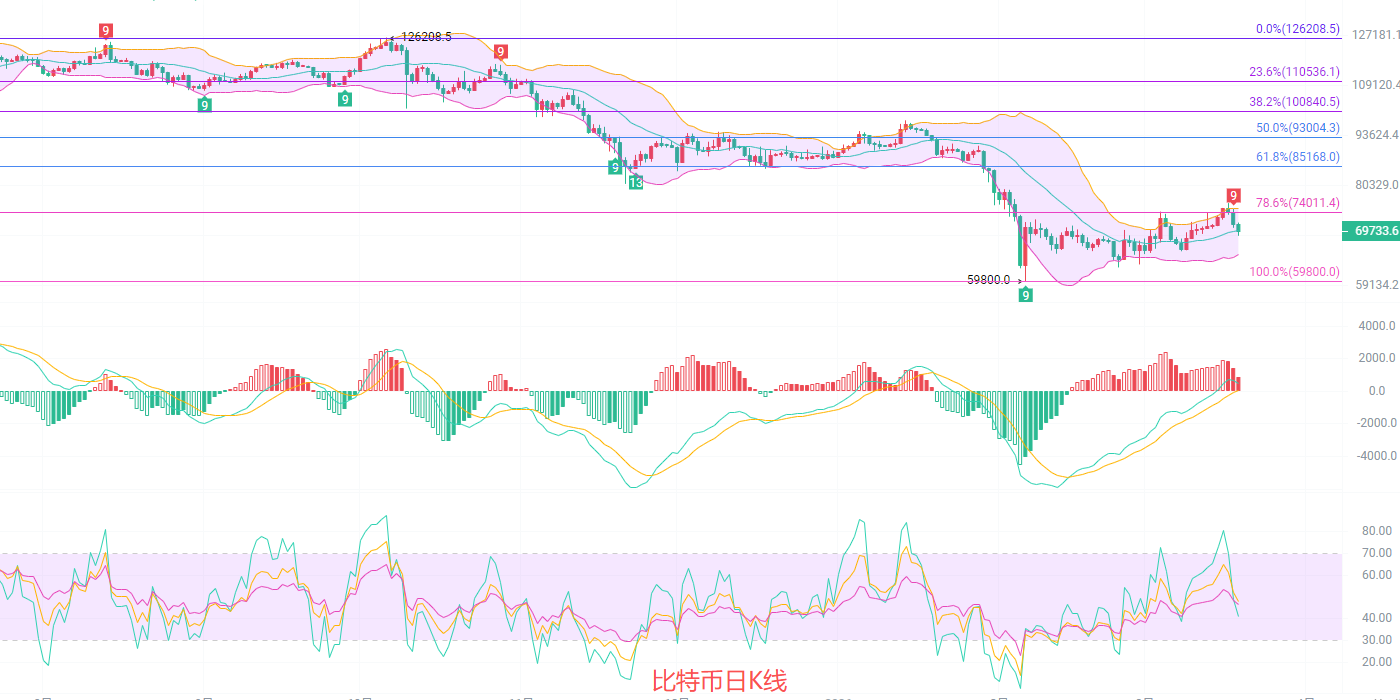 日线高位见顶,南下趋势确立,K线形态上形成乌云盖顶外加连阴回调组合,趋势与位置跌破 74000 关键支撑,目前在布林带中轨下方运行,布林带开口向下拐头,确认短期见顶信号,MACD指标信号红柱快速翻绿,DIF 与 DEA 死叉向下,RSI 从高位回落至 40 附近,说明多头动能彻底枯竭,南下开始全面接管市场。支撑点在69000若失守将进一步下探 68000 甚至更低。