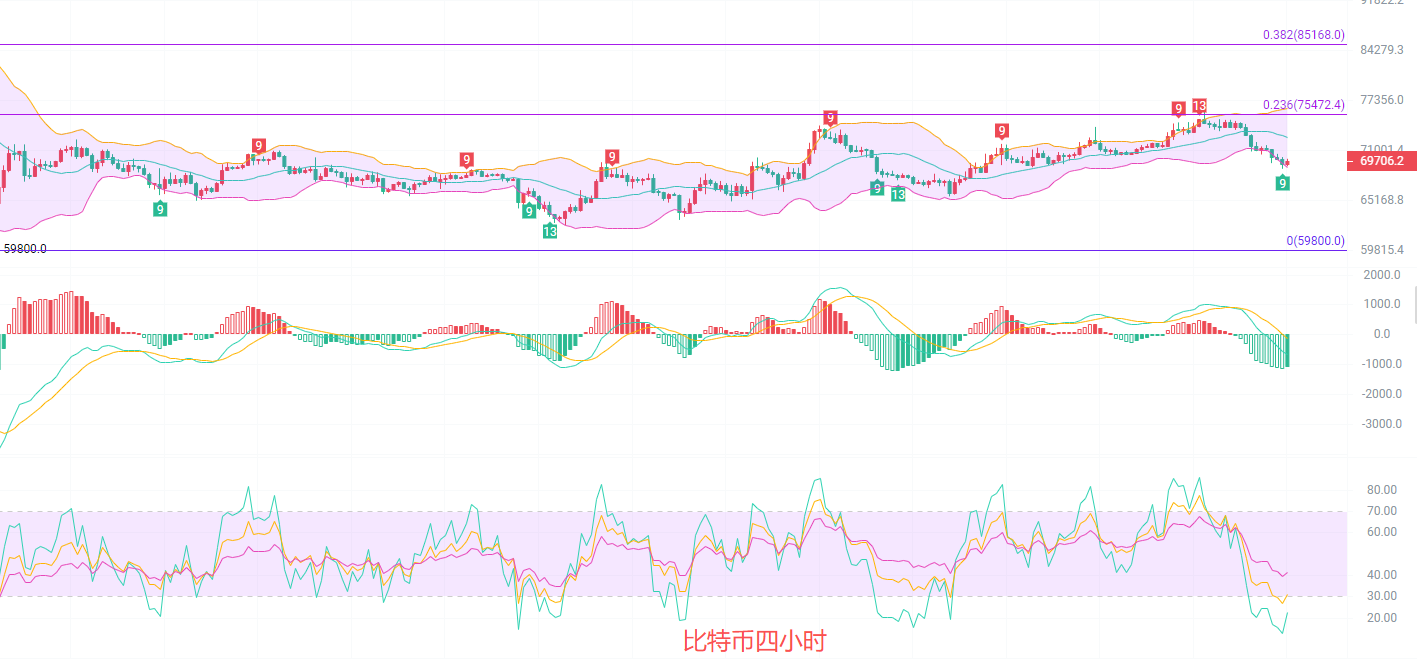 上方70200到70500南下,止损71000,目标看69500到69000,若价格跌破69000继续下看68500到68000