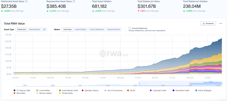 RWA.xyz 最新数据披露,截至2026年3月20日,RWA 链上总市值达273.5亿美元,环比上月同期大涨9.68%;资产持有者总数增至约68.12万,环比上月同期增加4.9%,与RWA规模增速匹配。