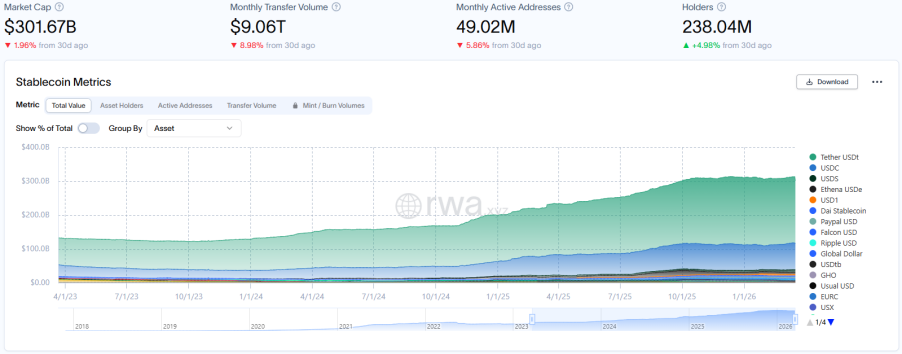 稳定币总市值回落至3,016.7亿美元,环比上月同期微降1.96%,结束此前连续两月的回升态势,流动性池再度承压;月度转账量下滑至9.06万亿美元,环比上月同期下跌8.98%。