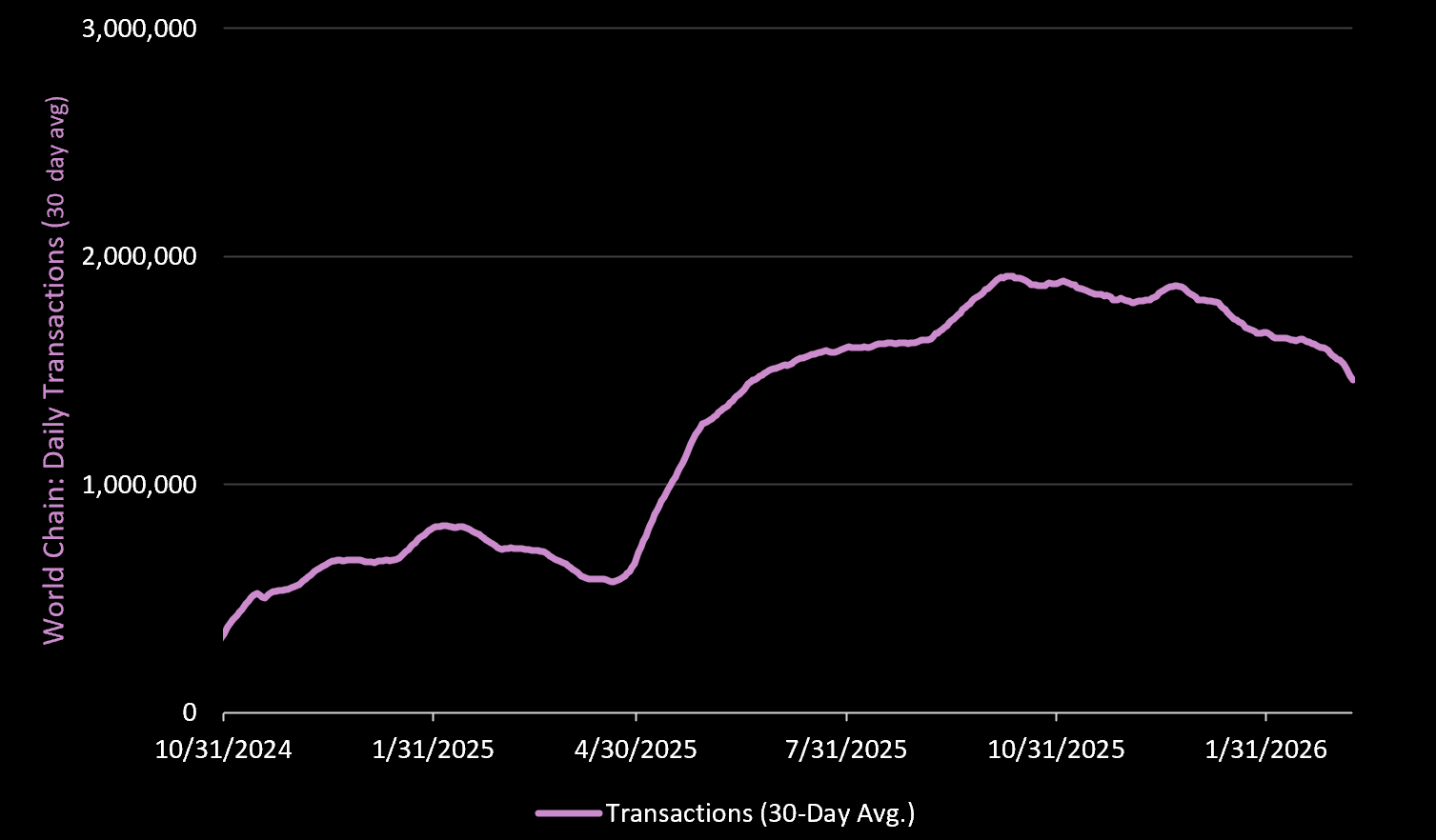 在过去 30 天里,World Chain 日均交易量达到 150 万笔,较一年前增长 103%。作为对比,同期 Base(顶级头部 L2 网络)日均交易量为 1060 万笔,Arbitrum 的日均交易量为 400 万笔。