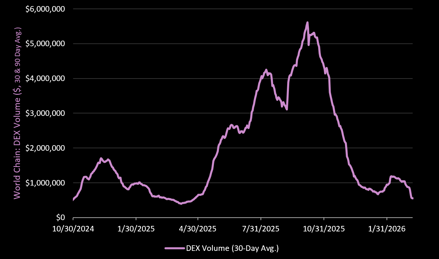 过去 30 天,World Chain 的 DEX 日均交易额为 55.2 万美元,较一年前下降 4.1%,较去年第四季度峰值水平则大幅下降 88%。目前,World Chain 上 100% 的 DEX 交易额均来自 Uniswap 的部署。