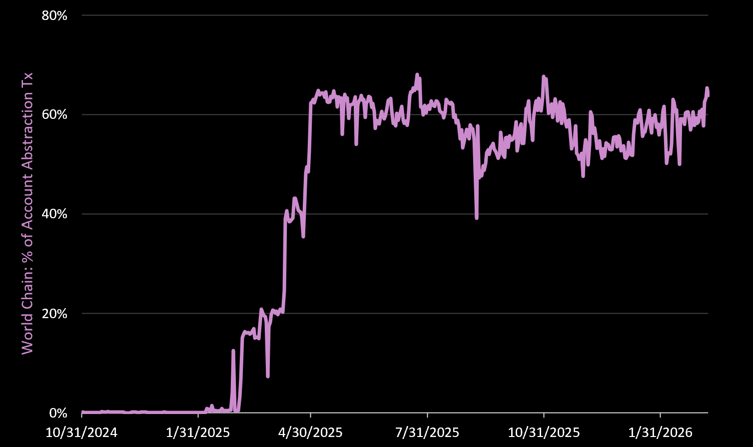 上图数据显示,World Chain 上 60% 的交易属于「账户抽象化」交易——这意味着用户仅需轻点手机应用界面即可完成操作,无需直接管理钱包或使用独立浏览器。
