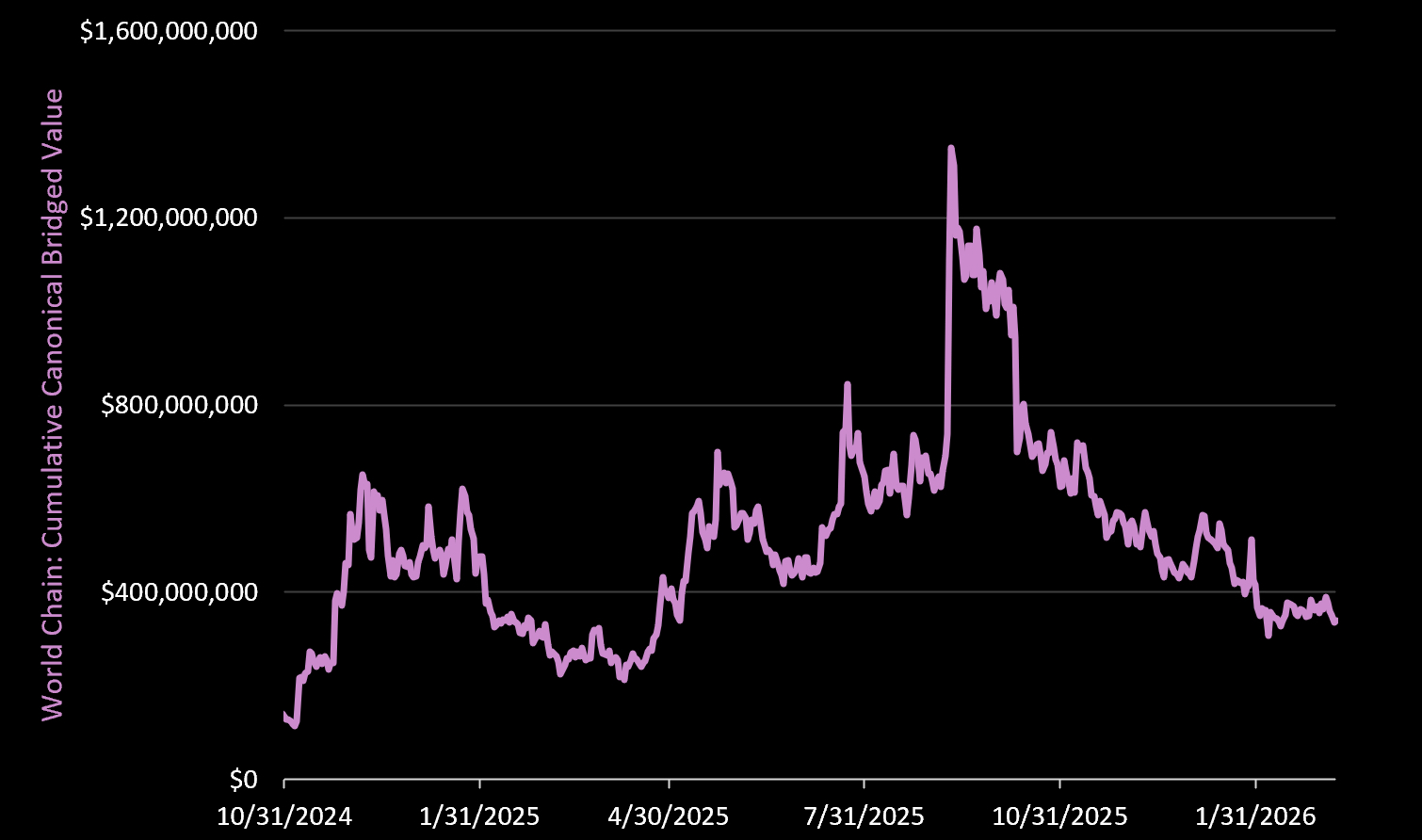 目前,World Chain 的官方桥接资产总值为 3.71 亿美元,较去年的 12.6 亿美元大幅下降。我们认为这一下滑主要归因于 WLD 代币价格下跌,而 WLD 占跨链资产总额的 93%。