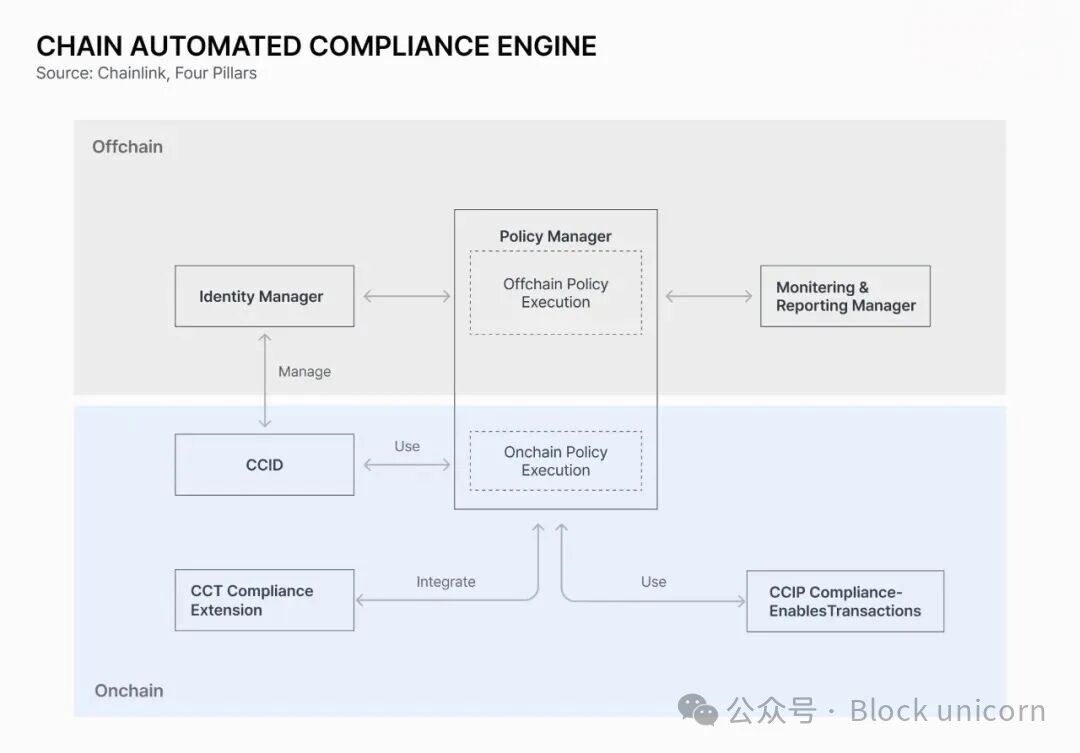 另一个组件,跨链代币合规扩展(Cross-Chain Token Compliance Extension,简称CCT),是一个模块化层,它将合规性逻辑附加到 ERC-20 和 ERC-3643 等代币标准上。它将代币连接到 CCID、策略管理器和 CCIP,使发行方能够在不重新设计代币结构的情况下嵌入合规性逻辑。