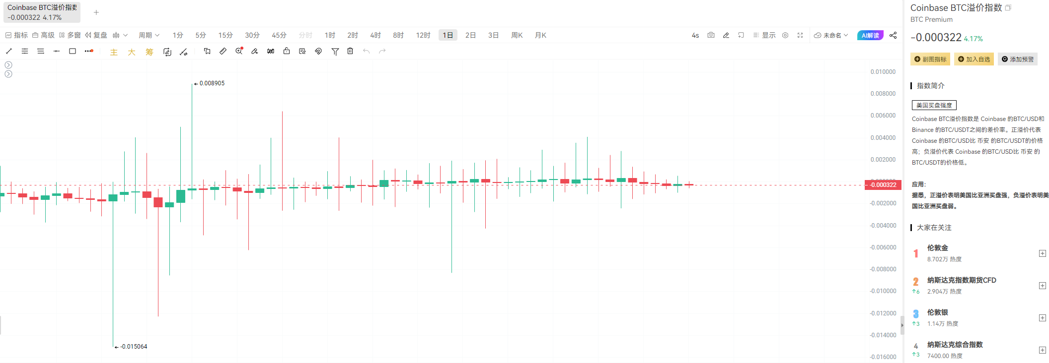 除了资金费率,还有一个指标是判断市场结构的关键:Coinbase 比特币溢价指数。