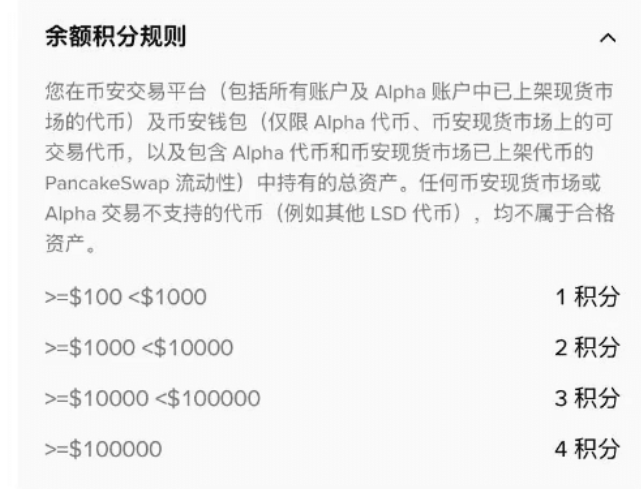 Alpha 积分分为余额分 + 交易量分,余额分只要账户有资产就自动发放。