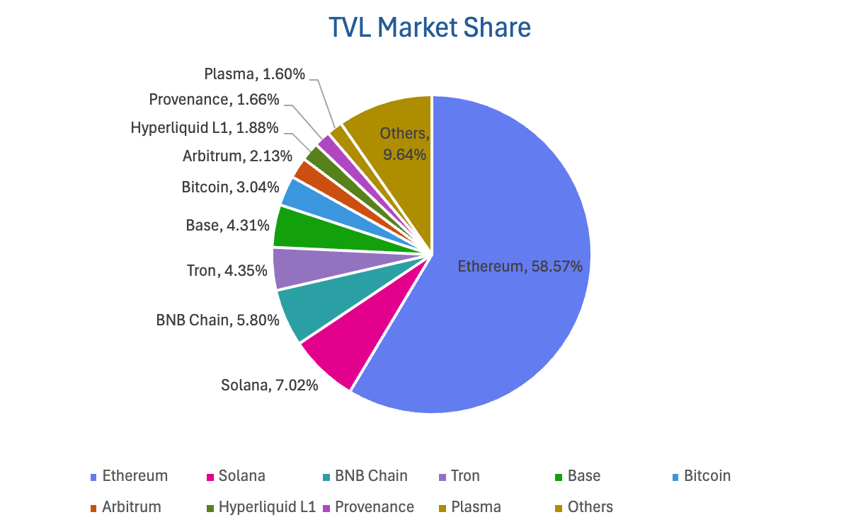 按公链进行划分,其中TVL最高的三条公链分别是Ethereum链,占比58.57%;Solana链,占比7.02%;BNB Chain,占比5.80%。