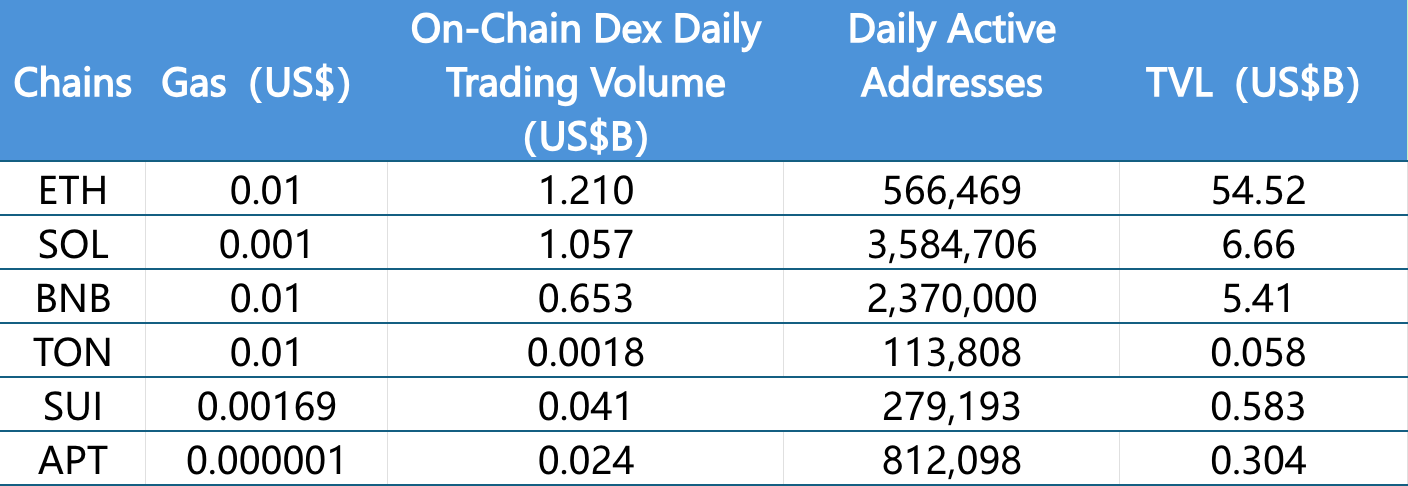 主要从日交易量、日活跃地址、交易费用分析目前主要Layer1含ETH、SOL、BNB、TON、SUI以及APTOS的相关数据。