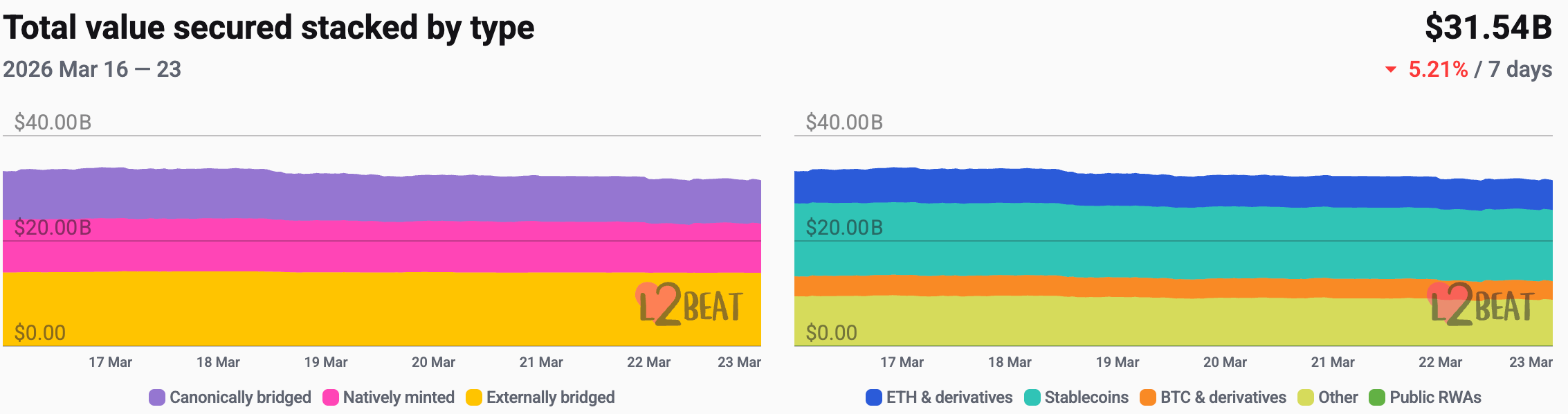 据L2Beat数据显示,本周以太坊Layer2总TVL为$315.4亿,较上周$332.1亿,整体跌幅为5.02%。