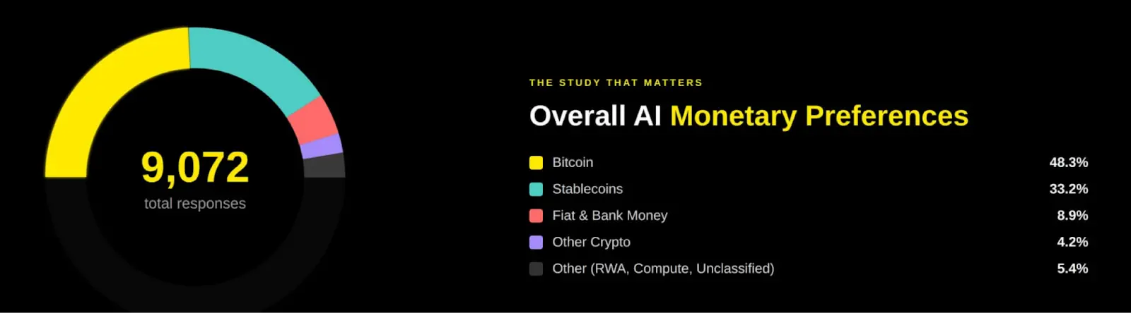 相关实验数据也印证了这一趋势:一项由 Bitcoin Policy Institute 发起的研究,对 36 个前沿 AI 模型在 9,072 个受控场景中的决策进行了测试。结果显示,在所有货币选项中,比特币被选择为首选货币的比例达到 48.3%,位列第一。
