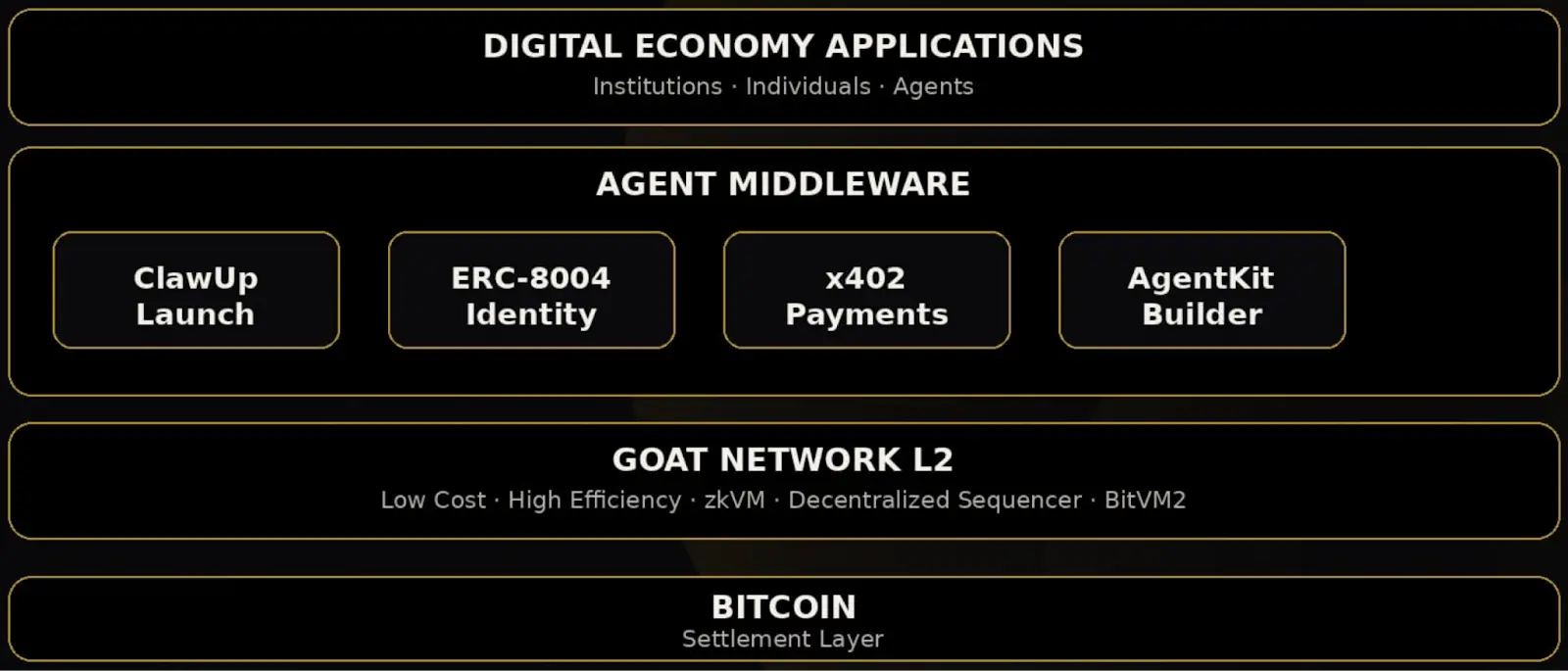 目前,我们已经完成了包括 GOAT L2(基于 BitVM2)、去中心化 Sequencer、ERC-8004、x402、AgentKit 与 ClawUp 在内的一整套基础设施。