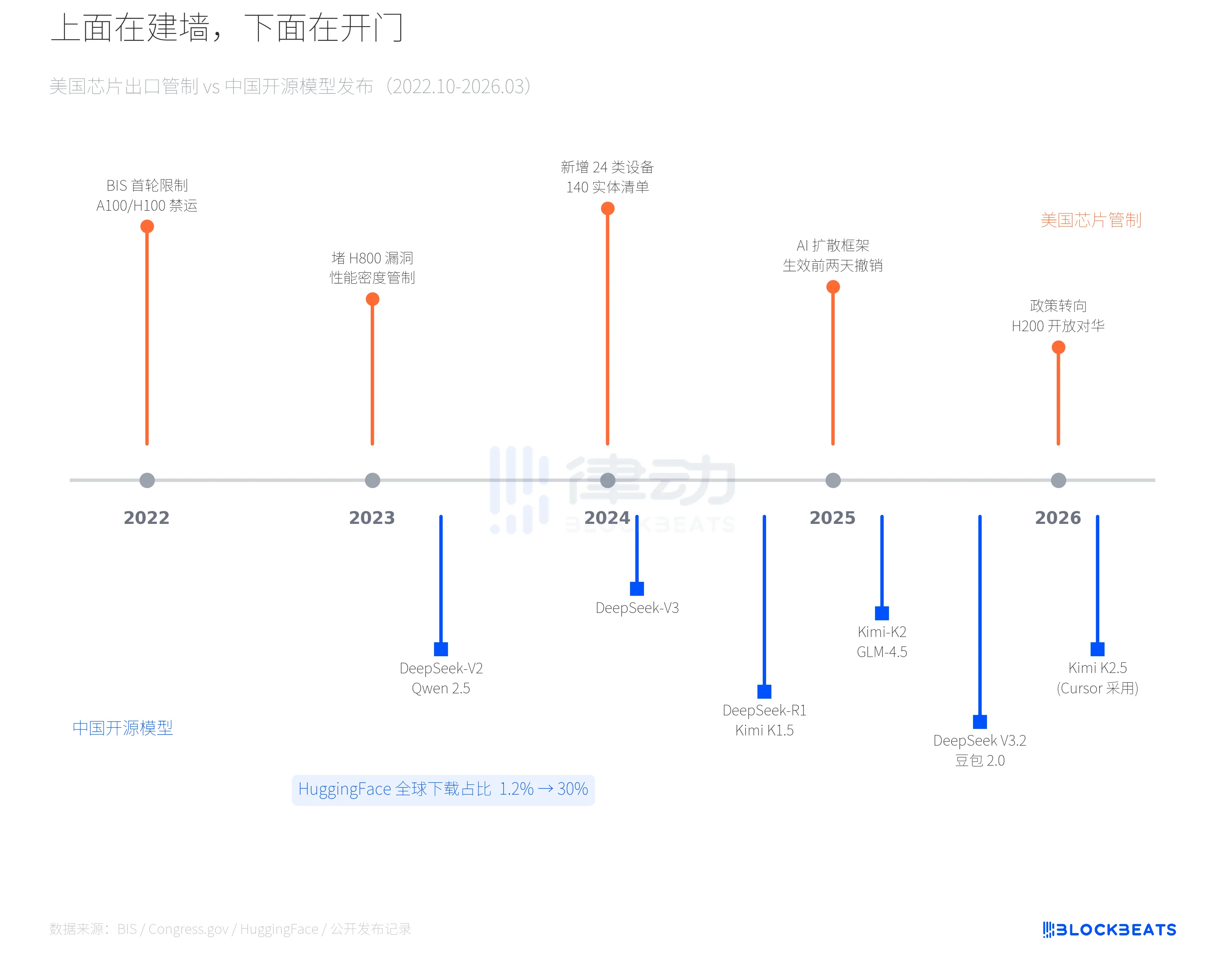 从 2022 年 10 月 BIS 首轮限制 A100/H100 级芯片出口开始,美国的芯片管制持续加码。2023 年堵上 H800 漏洞,扩大性能密度管制指标。2024 年 12 月再加一轮,新增 24 类半导体设备管制、将 140 个中国实体列入黑名单,连高带宽内存(HBM)和 DRAM 也被纳入限制范围。2025 年 1 月,商务部甚至推出了一个「AI 扩散框架」,试图从模型层面建立全球管制体系,但这个框架在正式生效前两天被自己撤销了。到 2025 年 12 月,特朗普又调转方向,允许 H200 芯片向中国批准客户出口。