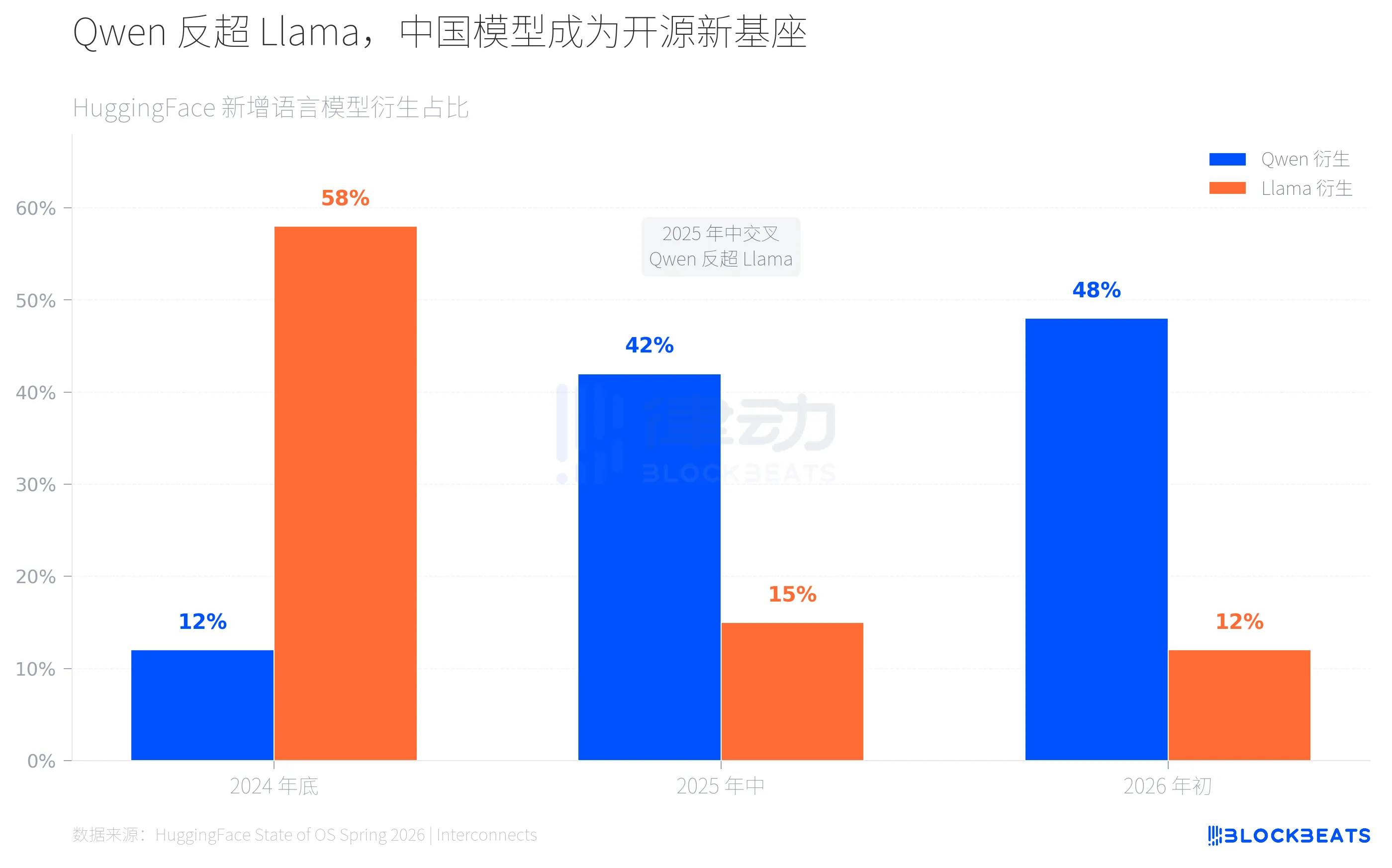 HuggingFace 上的变化肉眼可见。据平台统计数据,2024 年底 Llama 衍生模型占新增语言模型约六成,Qwen 仅占一成出头。到 2025 年年中,交叉点出现,据 HuggingFace 官方博客,Qwen 衍生占比飙升至 40% 以上,Llama 跌至约 15%。2026 年初,Qwen 衍生已接近半数,Llama 继续收缩至约 12%。
