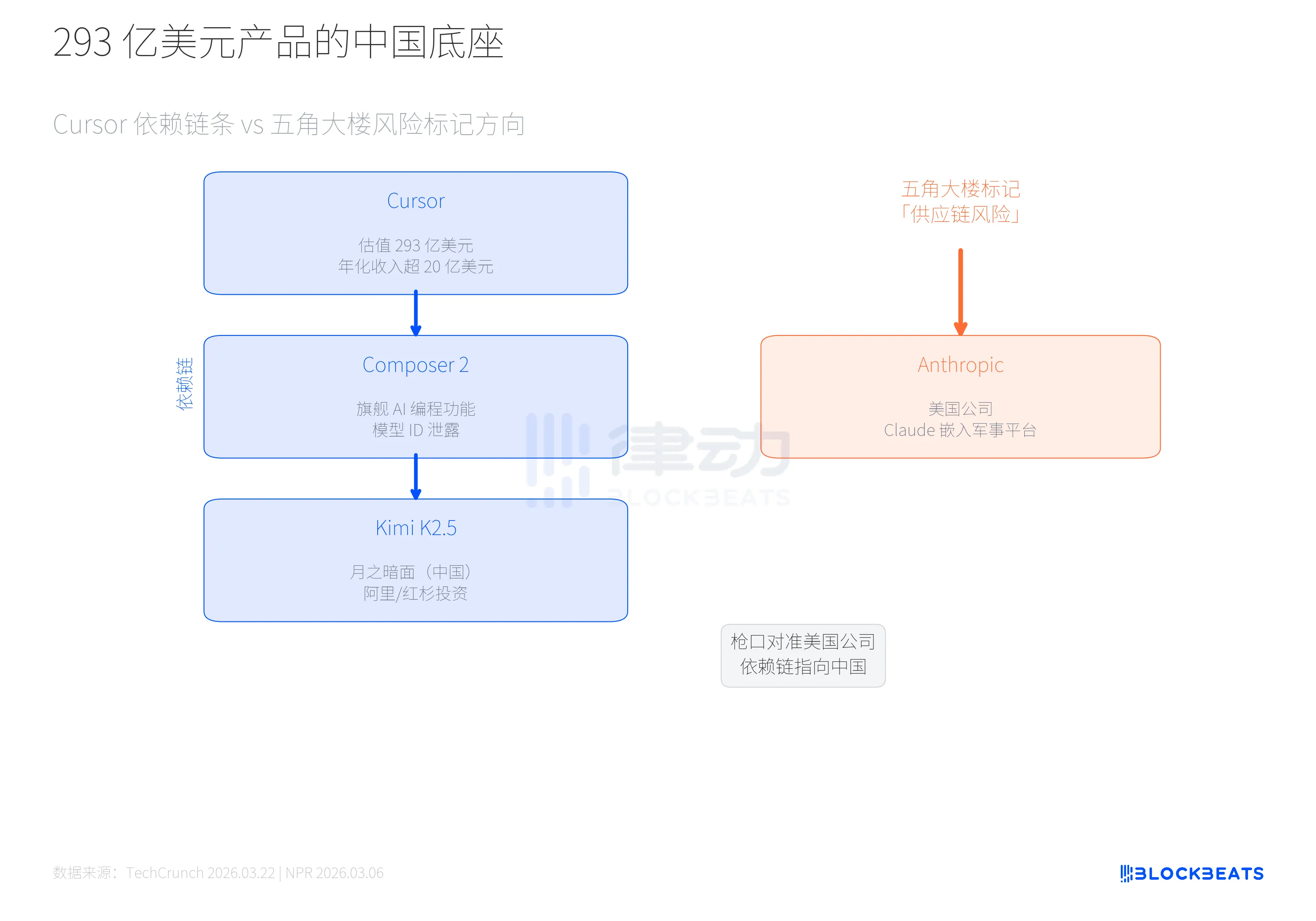 这组矛盾不是抽象的政策讨论。就在上周,估值 293 亿美元的 AI 编程工具 Cursor 被发现,其旗舰功能 Composer 2 的底层基座来自月之暗面的 Kimi K2.5。一家中国公司的模型,正在驱动美国最头部的 AI 开发工具。