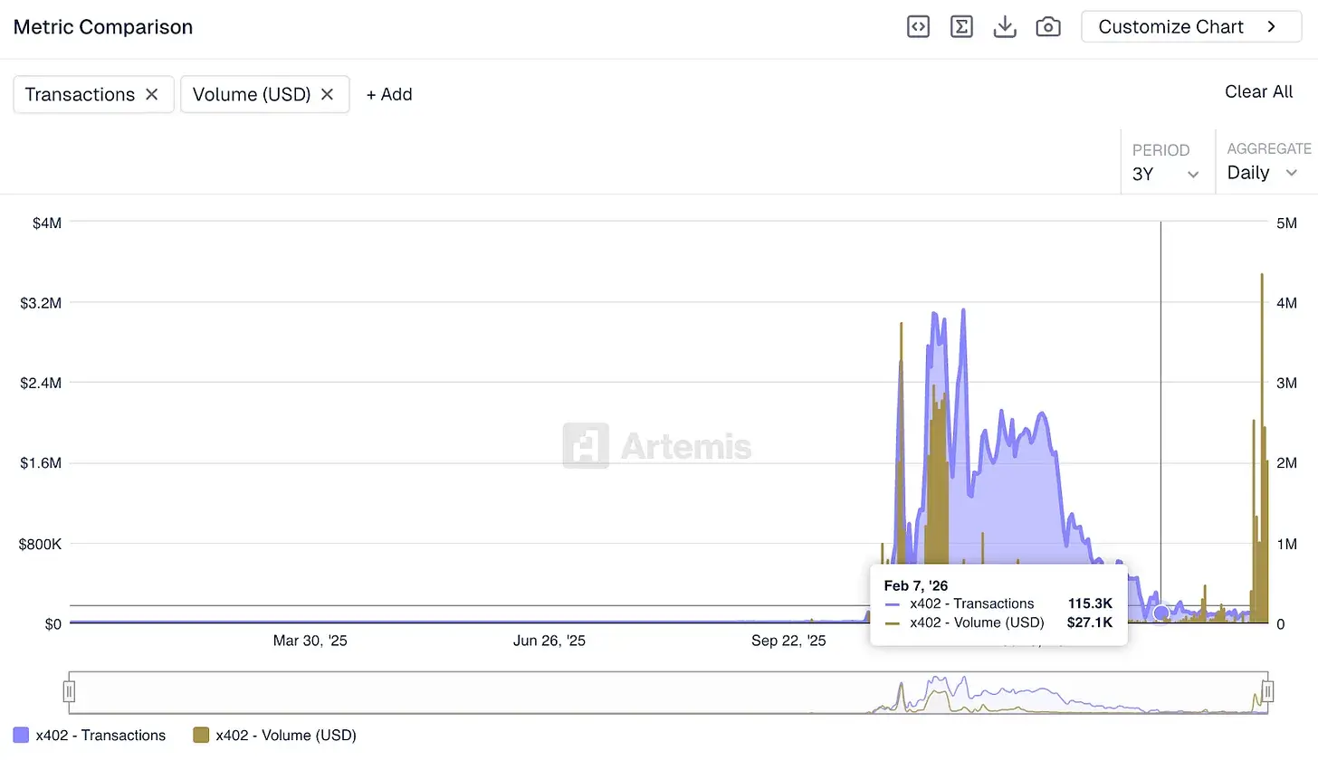 然而,x402 的交易量已经突破 5000 万笔。虽然单笔金额微不足道,但交易次数表明基础正在被使用,开发者正在其上构建。接受智能体的支付商户端正在增长。这就是支付网络诞生的方式。