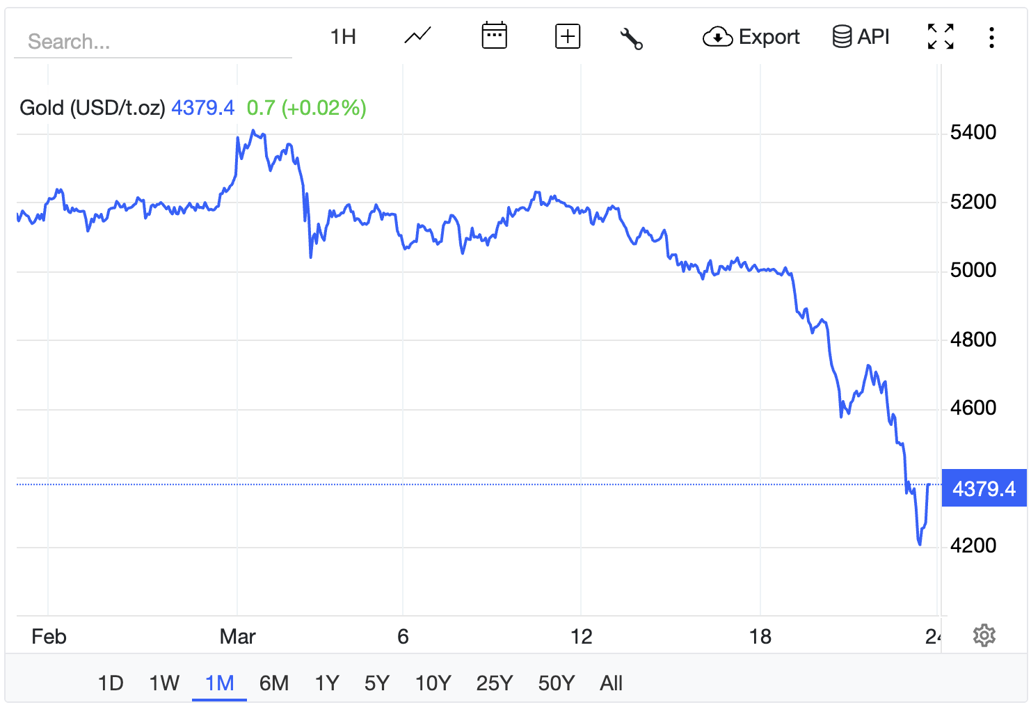 近期中东地缘政治危机升级,全球资本市场随之震荡。按照传统金融学的经典叙事,地缘冲突应当推高黄金价格 —— 这一逻辑根植于黄金数千年来的避险属性,早已成为市场参与者的本能反应。然而 2026 年 3 月的市场表现却打破了这个刻板印象:黄金价格持续走低,跌破 4500 美元关键支撑位,而比特币的跌幅却远小于股票等传统风险资产,展现出某种 「相对避险」 的特征。