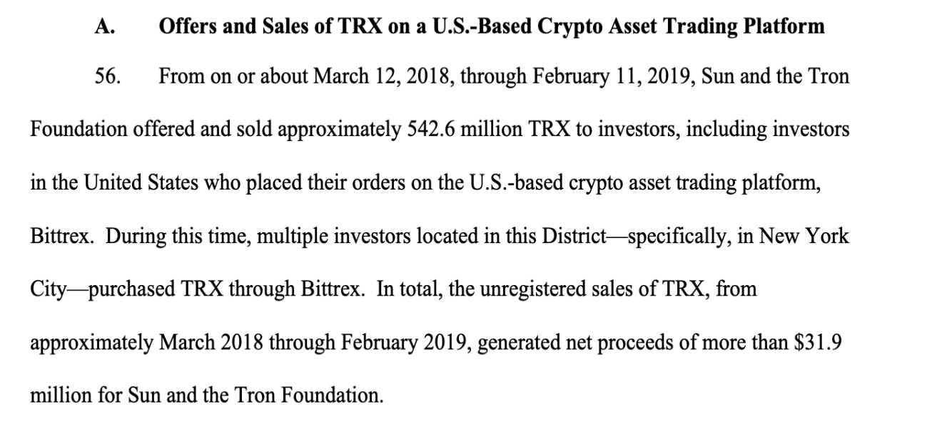 图片:SEC指控孙宇晨通过非法销售TRX获利超3190万美元