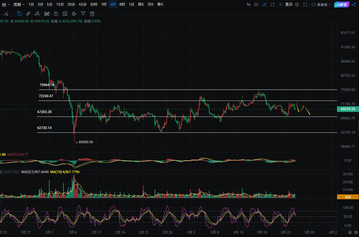 大饼现在砸到69400附近了,7万关口直接再度失守,整体偏空但短线有超跌反弹的味儿。日线破位走弱,价格被多条均线压制,MACD空头放量、RSI进入弱势区,下轨看向68000强支撑,反弹先看70500收复情况,站不回去大概率继续向下探底。4小时妥妥下降通道,均线空头排列,MACD绿柱拉长,RSI接近超卖但没背离,反弹力度有限。关键压力在70500,跌破68500可能会加速下跌。1小时超跌后小幅修复,KDJ低位金叉、MACD有底背离雏形,短线有反弹需求。不过反弹得突破70500才能缓解颓势,不然反弹完还得往下冲。简单来说就是:大周期空头主导,短线超跌小反弹,盯紧68000支撑和70500压力就行。