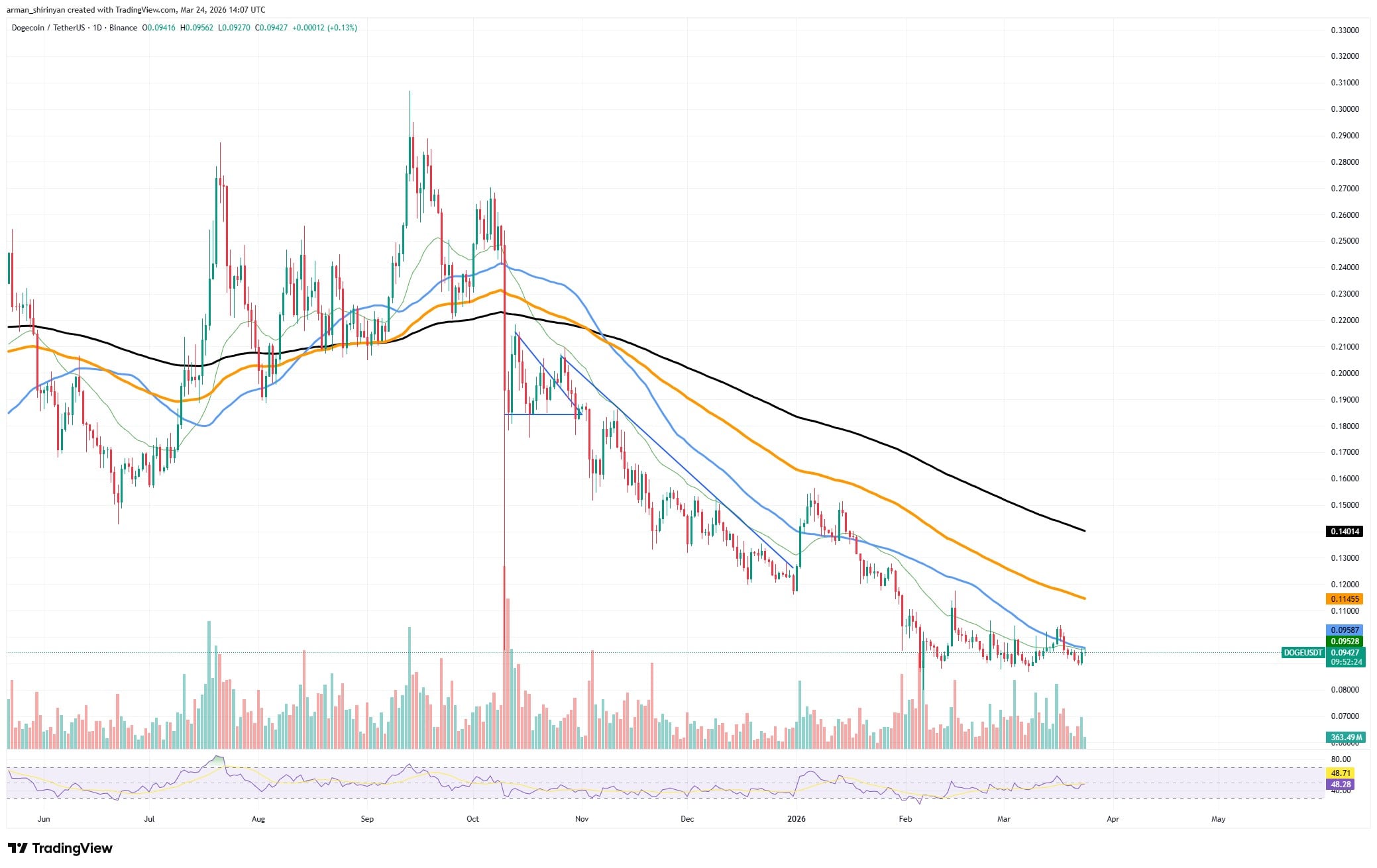 在长期下跌后,狗狗币开始趋于稳定,此期间特点是不断降低的高点和持续的压力低于所有主要移动平均线。价格动作现在正在形成一个紧密的整合区间,位于短期移动平均线下方,而不是激进地抛售。这一变化是重要的。