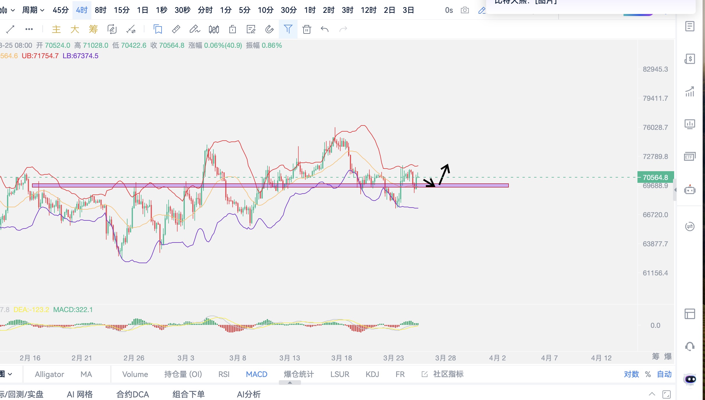 昨天分析小级别缺口在69500-69000,一般消息面下单根K线强势拉升形成的缺口,大部分会回补。昨天也是测试回补了此位,并且此位还是底部的突破缺口,测试后再度反弹,我们分析过,如果回补不反弹宣告拉升结束,但昨日回补后出现了反弹那么价格将再大概率蓄力怕测压