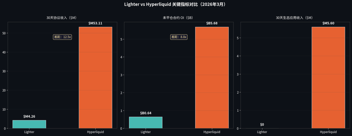 Lighter 与 Hyperliquid 的差距,表面上是收入规模的差距(12.5 倍),但本质上是生态建设阶段的差距。