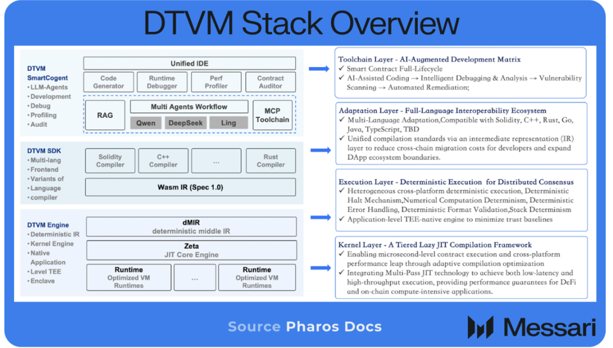 Pharos 执行层核心为确定性虚拟机(DTVM)栈,以并行双虚拟机架构替代传统顺序处理模型。