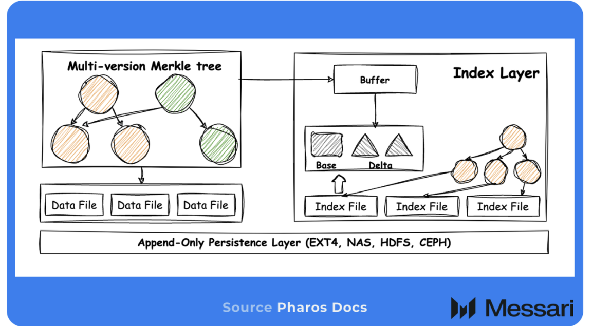 • Pharos Store 将默克尔树直接嵌入存储底层,把传统 8 至 10 次磁盘读取的 I/O 路径压缩至 1 至 3 次,解决多数高性能并行公链难以突破的隐形吞吐量瓶颈。