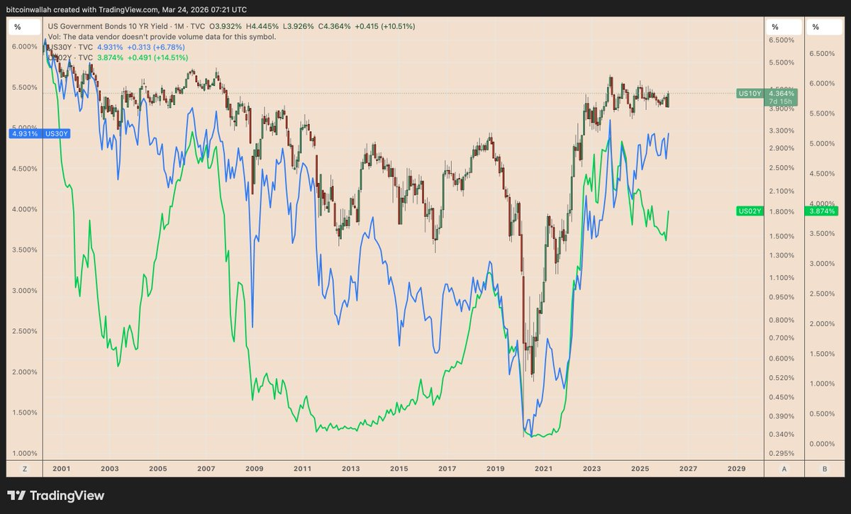 美国 2 年期、10 年期及 30 年期国债收益率月度表现。来源:TradingView