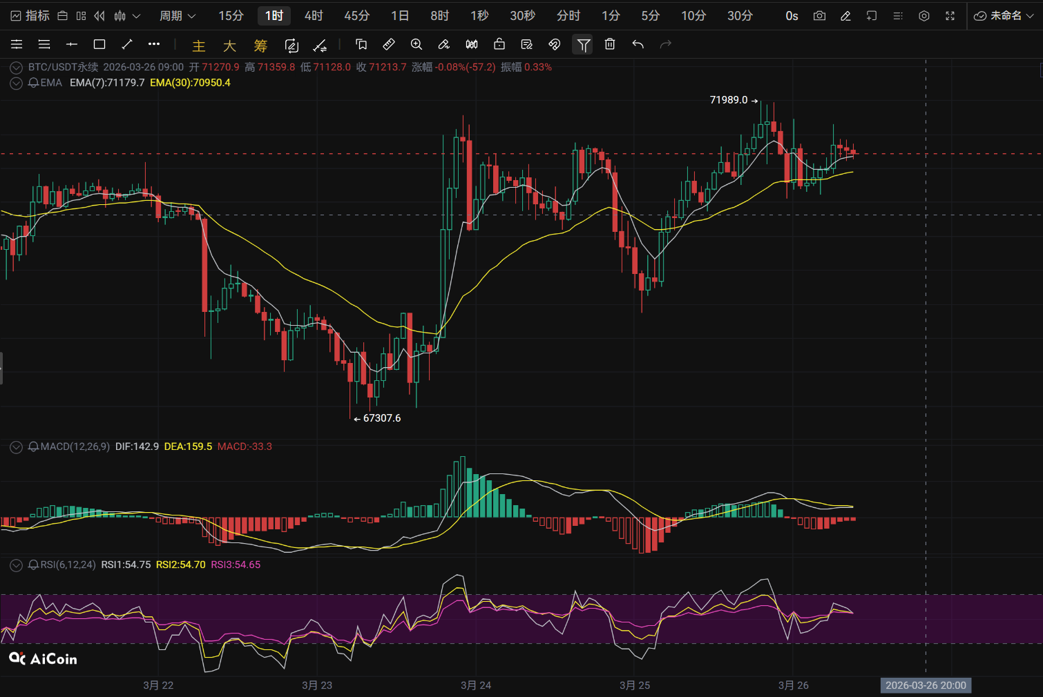 1小时级别近期形成双顶结构(71931和71606),当前价格在71200附近震荡,需要警惕破位的风险,日线级别3月23日出现长下影线后继续三日收阳,但25日冲高71999后回落留下长下影线,显示71500上方抛压沉重。