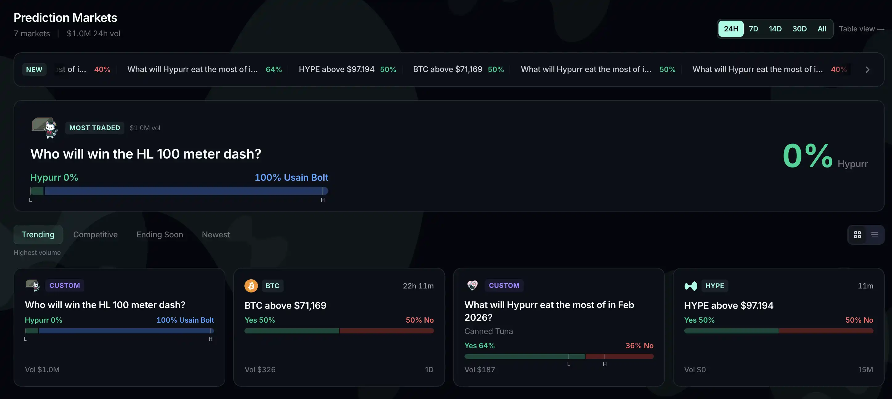 假设有人开了一个「谁会赢得 100 米短跑」的市场,事件 ID 是 9,结果 0 代表「Hypurr 获胜」,那么这个结果会被映射成 HyperCore 上的「#90」代币,放在订单簿交易。交易者买卖它,就像买卖一个现货标的一样。