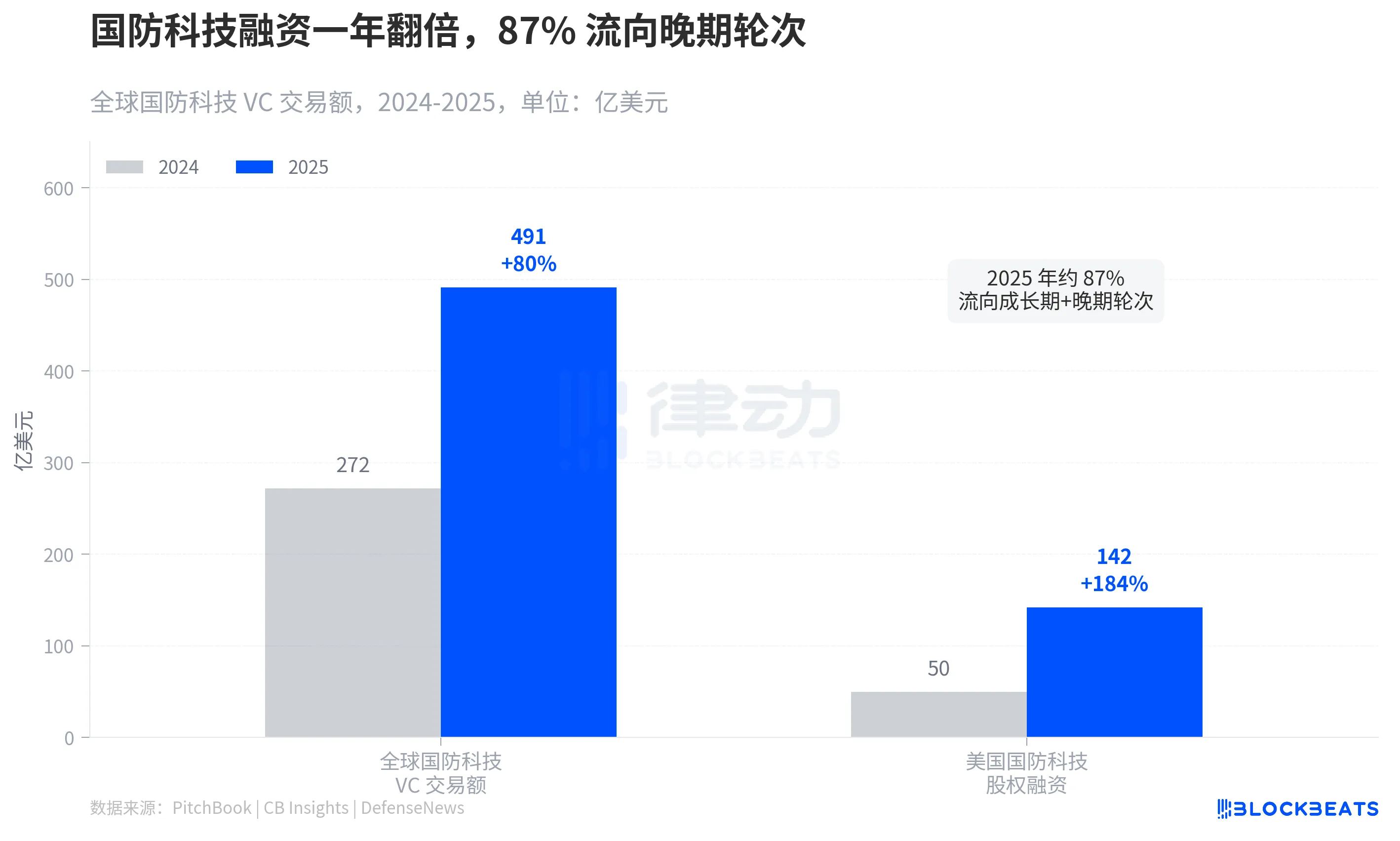 据 PitchBook 数据,2025 年全球国防科技 VC 交易额达到 491 亿美元,较 2024 年的 272 亿近乎翻倍。据 DefenseNews 报道,美国国内的国防科技股权融资从 2024 年的 50 亿美元飙升至 142 亿,增幅接近 3 倍。其中约 87% 的资本流向了成长期和晚期轮次。资金不再投向实验性原型,而是流向准备量产交付的公司。据摩根大通估算,2021 年以来全球国防科技累计吸收了约 1,300 亿美元风险投资。