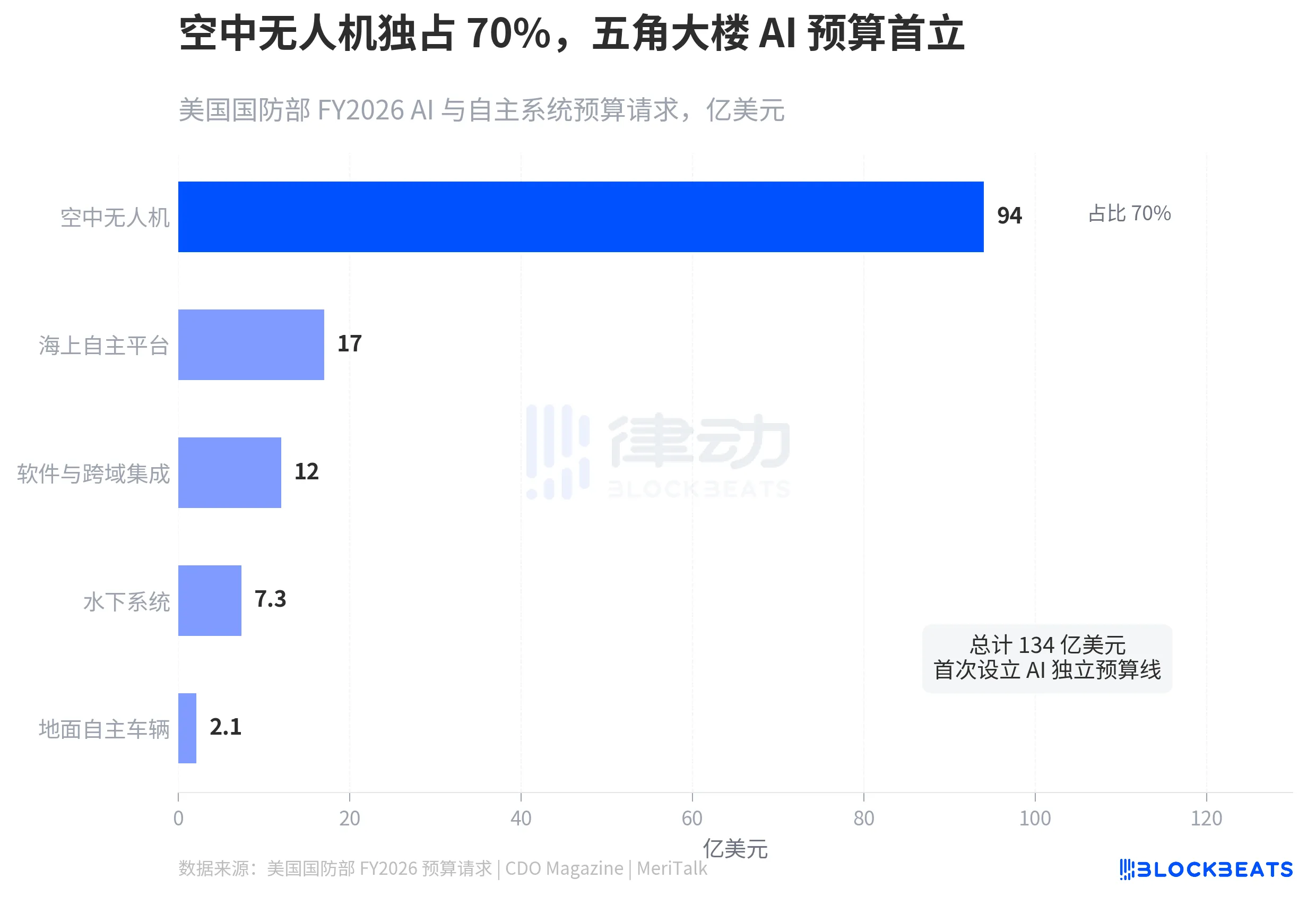 据美国国防部 FY2026 预算请求,五角大楼首次为 AI 和自主系统设立独立预算线,总额 134 亿美元。其中空中无人机拿走 94 亿,占比超过 70%。海上自主平台 17 亿,软件与跨域集成 12 亿,水下系统 7.3 亿。这是 FY2026 总预算 1.01 万亿美元中单独拎出来的 AI 专项。此前美军从未将 AI 和自主系统作为独立预算类目。