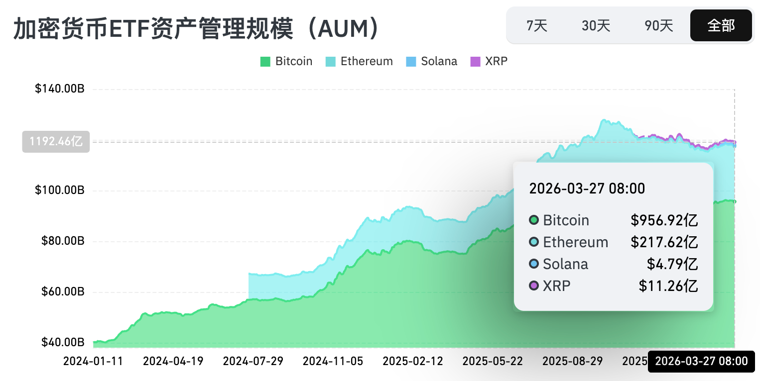 据统计,在3月23日-3月27日期间,美国比特币现货ETF净流出:2.878亿美元;截止到3月27日,GBTC(灰度)共计流出:259.64亿美元,目前持有102.08亿美元,IBIT(贝莱德)目前持有518.44亿美元。美国比特币现货ETF总市值为:879.09亿美元。