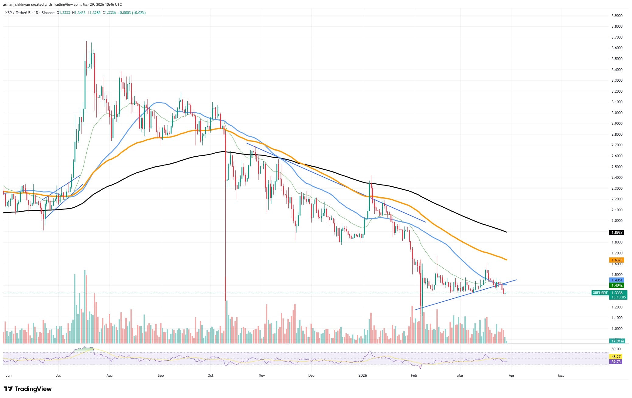 XRP的价格仍然明显处于下行趋势,不断下降的移动平均线持续拒绝其上涨并形成低高点。该资产最近尝试突破短期上升支撑趋势线,但未能维持动能,回落至1.30至1.35美元的区间。目前,该区域充当了一个重要的支撑区。如果跌破这一点,可能会导致1.20美元区域,与2026年的前低一致。