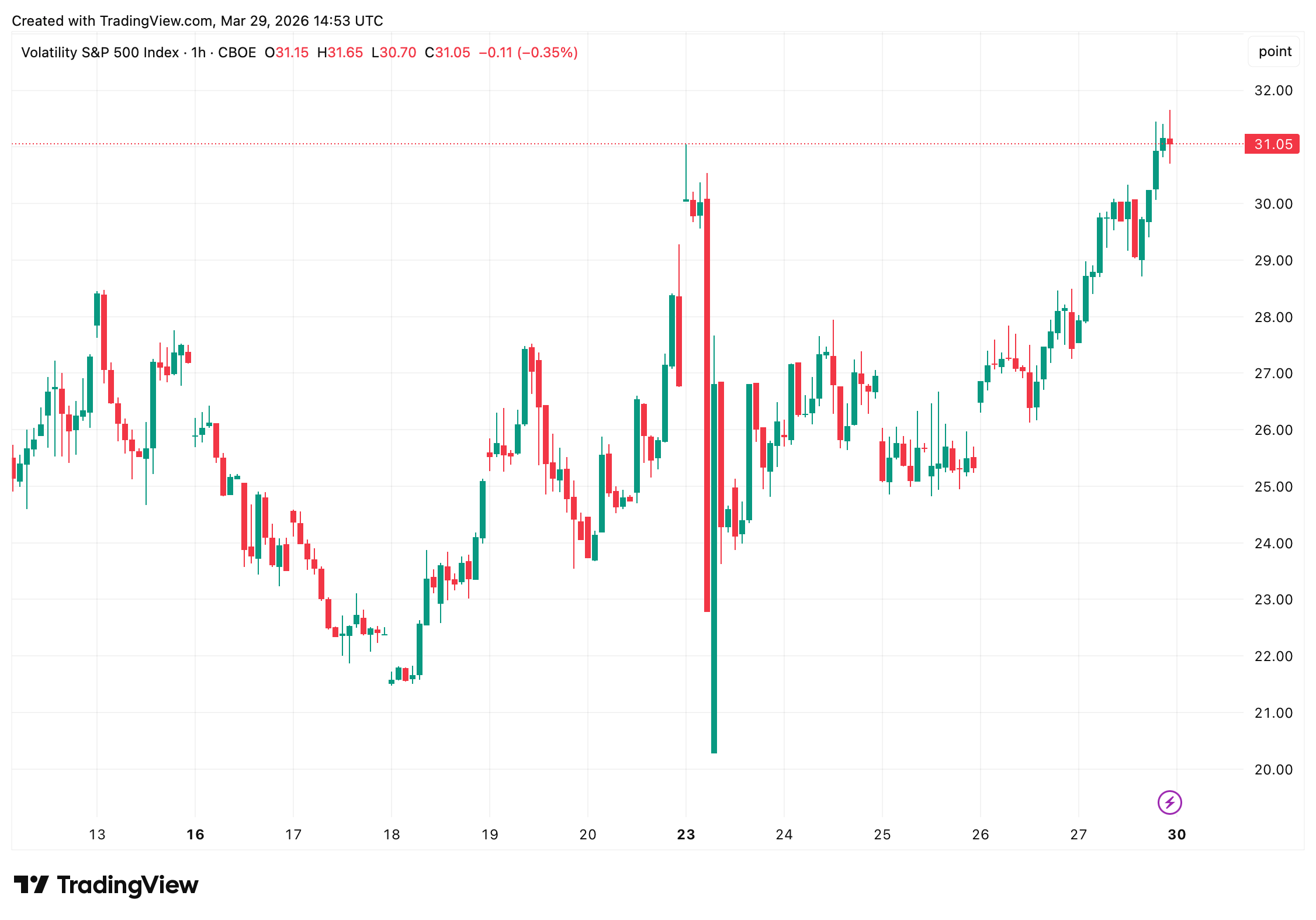 VIX 是根据标准普尔 500 指数期权定价得出的,它衡量未来 30 天的预期波动性。读数高于 30 表示交易员预计短期内会出现重大波动。周五收盘于 31.05,较会话上涨 3.61 点,继此前连续四周收盘高于 25,这是自 2022 年以来最长的一段时间。
