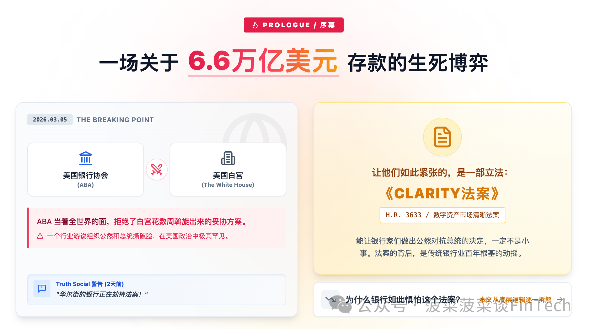 2026年3月5日,美国银行协会(ABA)干了一件罕见的事:它当着全世界的面,拒绝了白宫花数周斡旋出来的妥协方案。两天前,特朗普刚在Truth Social上公开警告银行正在"劫持法案"。