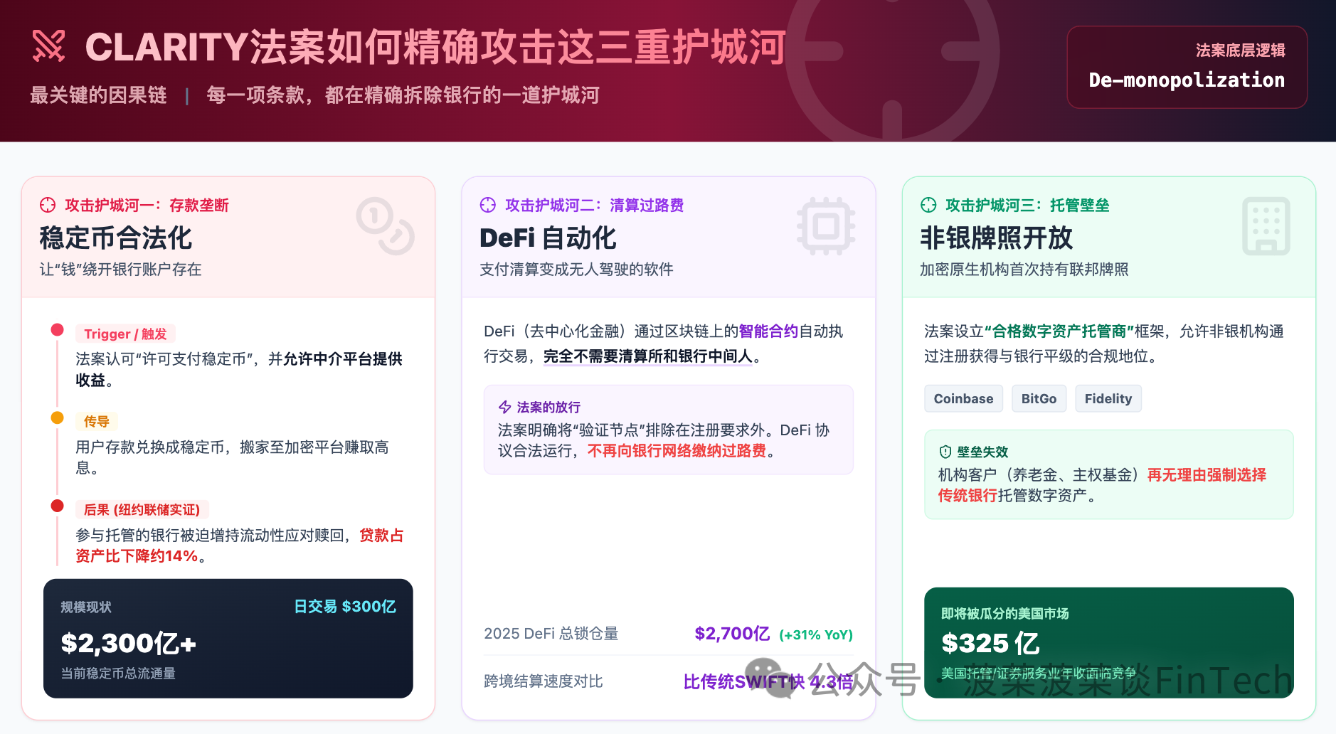 《CLARITY法案》精确瞄准银行三重护城河逐一拆除。存款端:法案赋予稳定币合法地位并允许平台提供收益;清算端:法案将去中心化活动排除在注册要求之外,使DeFi合法绕过银行清算网络;托管端:法案设立联邦托管商框架,325亿美元托管市场向非银敞开。三刀叠加,银行的垄断护城河正被系统性拆除。