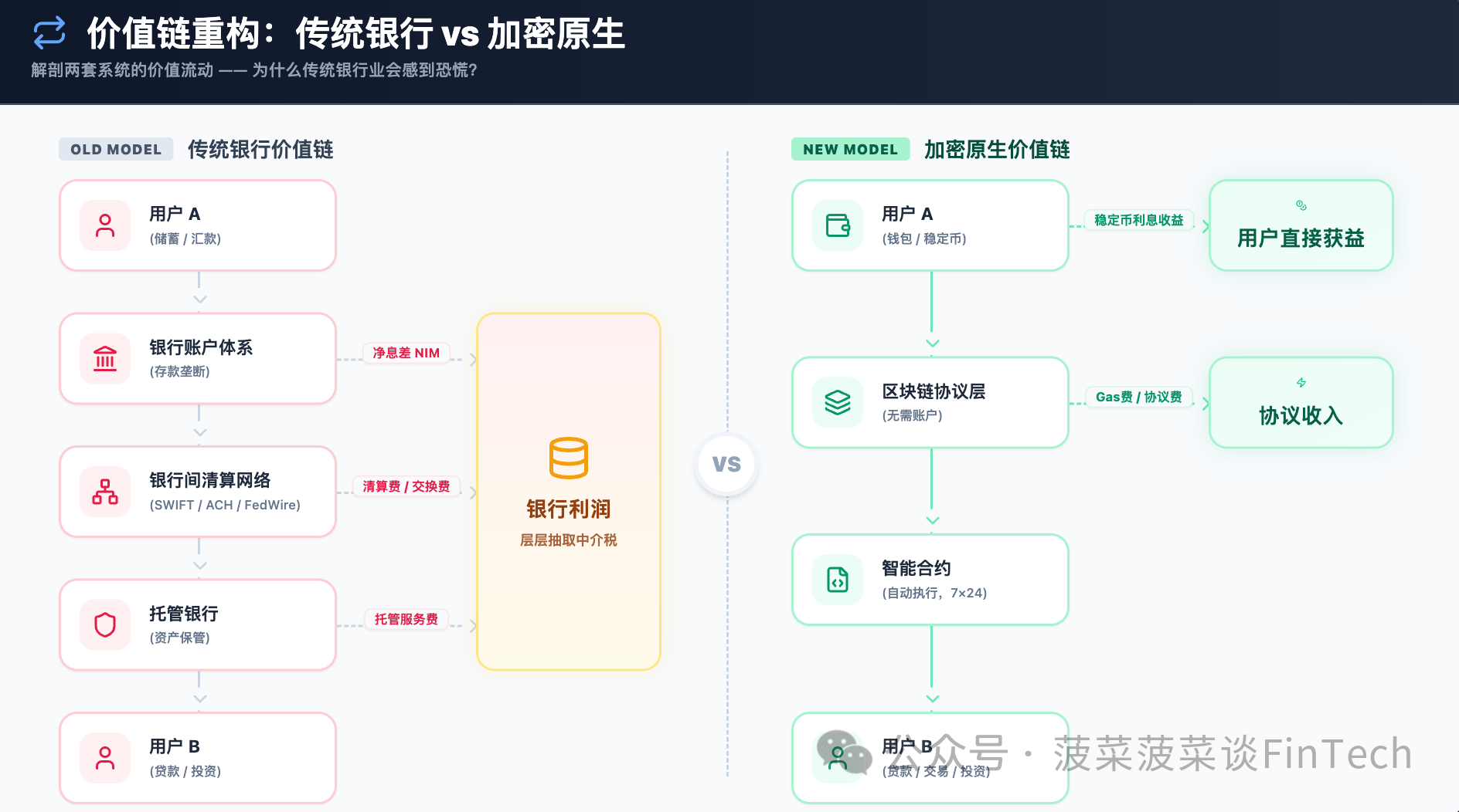 在新模式中,A和B通过钱包地址直接交互,区块链协议替代了中间的三层结构,结算时间从"工作日"压缩到"秒",跨境汇款成本从3%-7%降至不到1%。