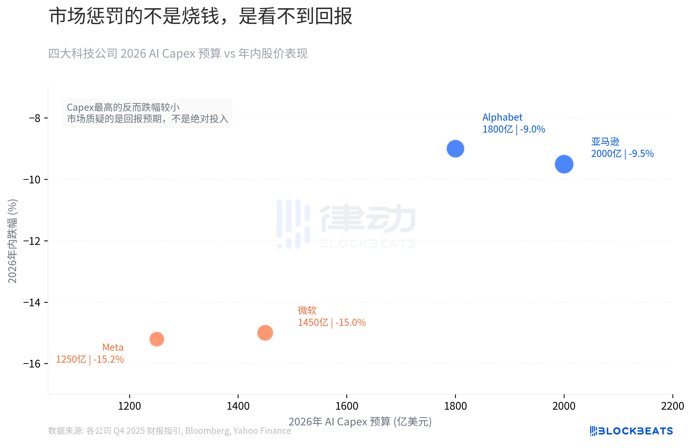 Capex 开得最大的亚马逊(2000 亿美元)和谷歌(1800 亿美元),年内分别只跌了 9.5% 和 9%。反而是 Capex 更低的微软(1450 亿美元)和 Meta(1250 亿美元),跌了 15% 和 15.2%。花钱最多的跌得最少。