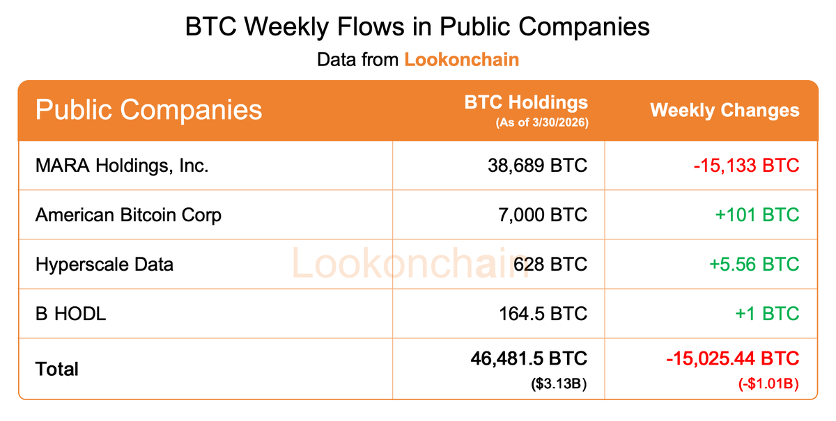 比特币矿工MARA(@MARA)在2026年3月4日至3月25日期间,以平均价格约72,689美元出售了15,133个比特币(11亿美元)。