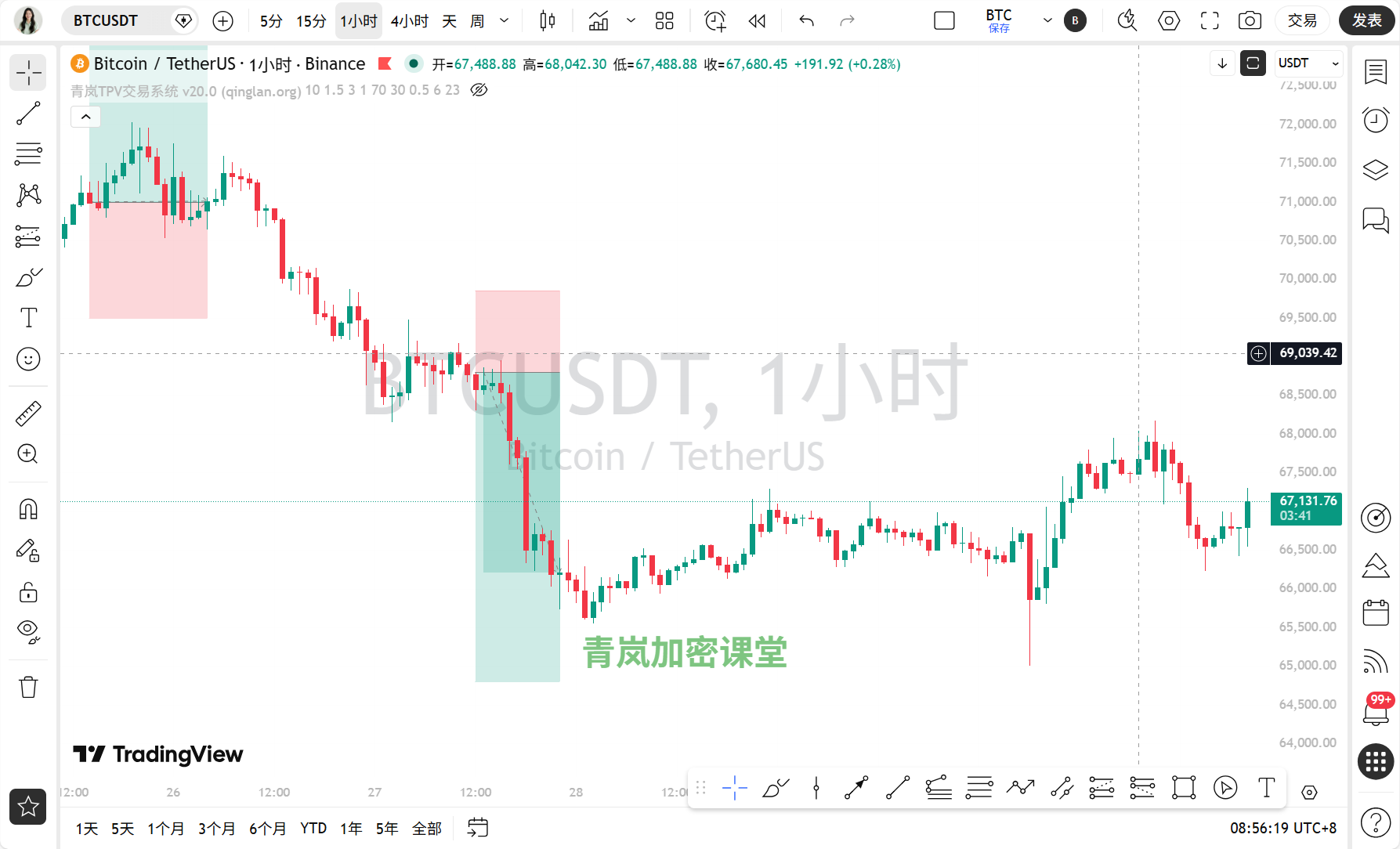 目标区域:如果下跌,首要目标看66600-66700(1小时支撑区域),进一步看66544.51。