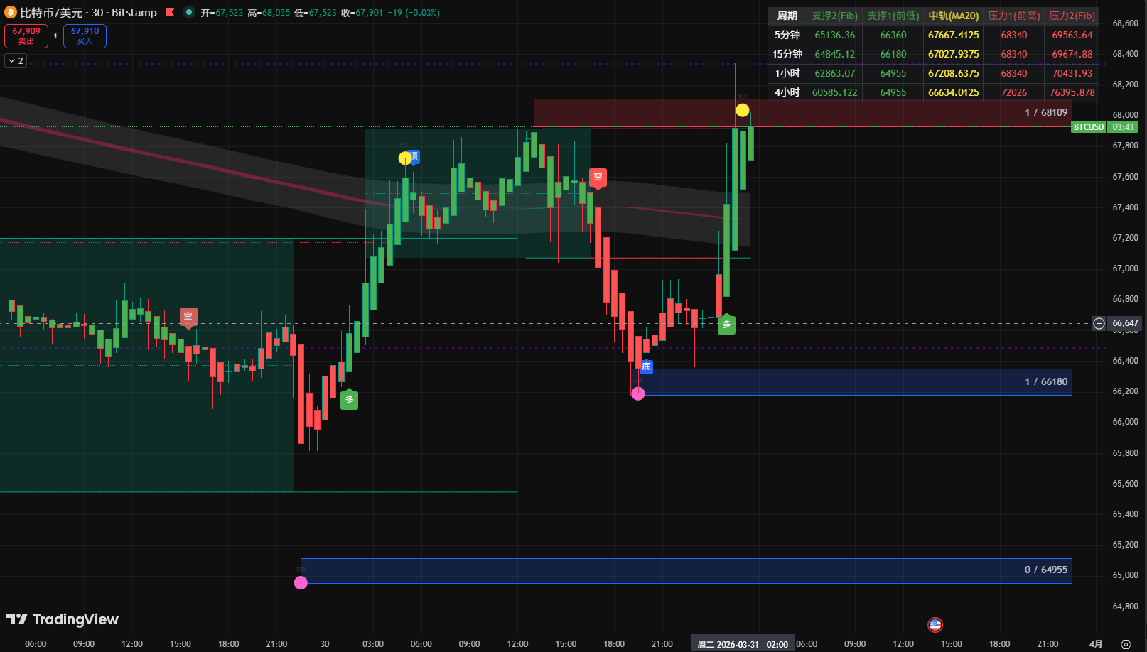 图中可见价格在回测 65000 支撑后开启了一波强势反弹,并一度冲高至 68408