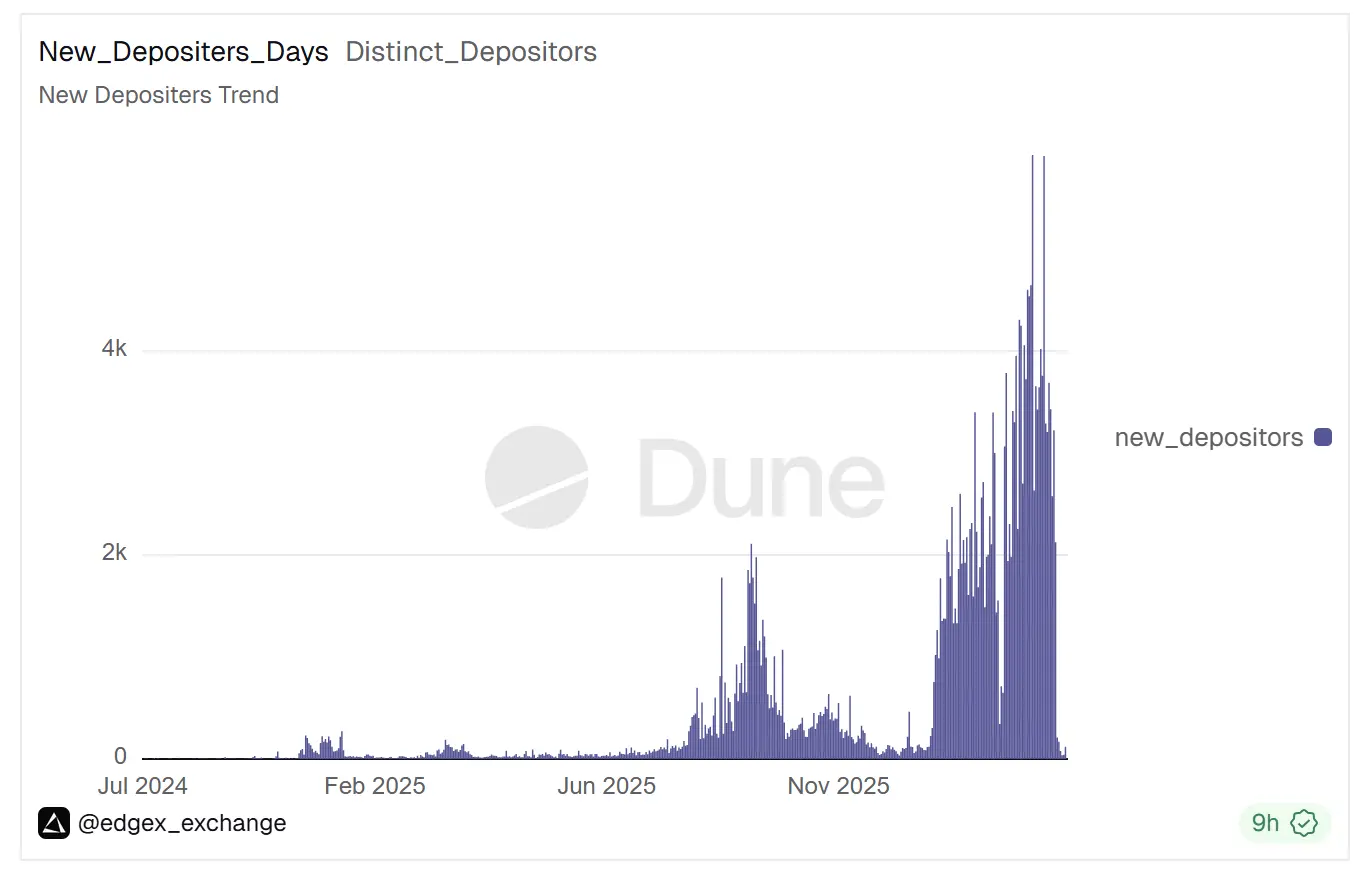 自 2025 年 8 月以来,edgeX 的交易量进入增长快车道,至今累计用户地址数量超过 47 万,总交易量超过 877 亿美元,当前总 TVL 超过 3.6 亿美元。此外,edgeX 还从这些交易中赚取了超过 1.8 亿美元的手续费收入。
