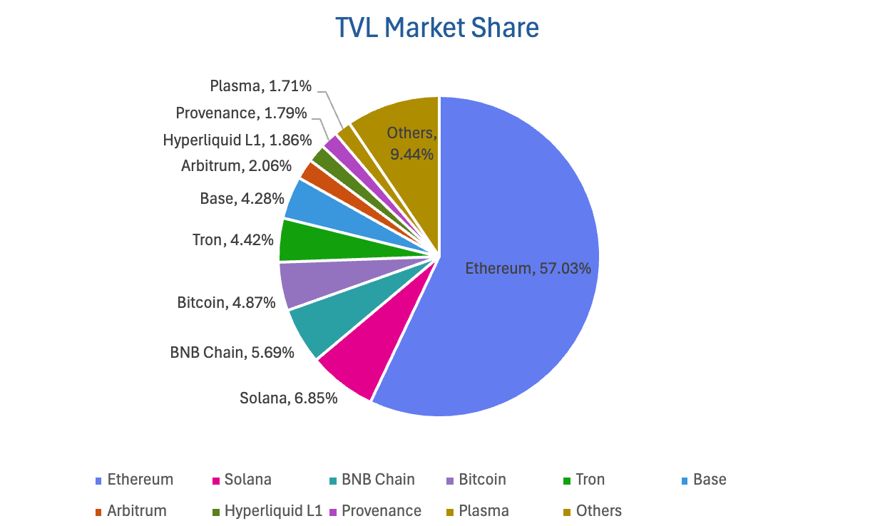 按公链进行划分,其中TVL最高的三条公链分别是Ethereum链,占比57.03%;Solana链,占比6.85%;BNB Chain,占比5.69%。